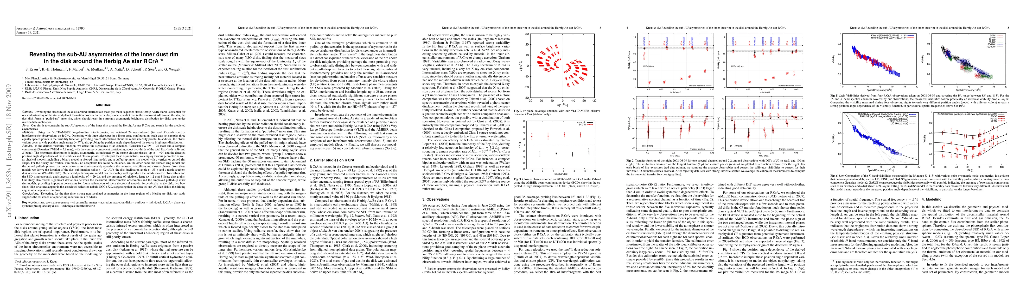 Models predict that in the innermost AU of the disk around Herbig Ae/Be star, the dust disk forms a "puffed-up" inner rim, which should result in a strongly asymmetric brightness distribution for disks seen under intermediate inclination. Using the VLTI/AMBER long-baseline interferometer, we obtained 24 near-infrared (H- and K-band) spectro-interferometric observations on the Herbig Ae star R CrA. In the derived visibility function, we detect the signatures of an extended (25 mas) and a compact component (5.8 mas), with the compact component contributing about 2/3 of the total flux. The brightness distribution is highly asymmetric, as indicated by the strong closure phases (up to 40 deg) and the detected position angle dependence of the visibilities and closure phases. To interpret these asymmetries, we employ geometric as well as physical models, including a binary model, a skewed ring model, and a puffed-up inner rim model with a vertical or curved rim shape. Our curved puffed-up rim model can reasonably well reproduce the interferometric observables and the SED simultaneously and suggests a luminosity of 29 L_sun and the presence of relatively large (> 1.2 micron) Silicate dust grains. Perpendicular to the disk, two bow shock-like structures appear in the associated reflection nebula NGC 6729, suggesting that the resolved sub-AU size disk is the driving engine of a large-scale outflow. Detecting, for the first time, strong non-localized asymmetries in the inner regions of a Herbig Ae disk, our study supports the existence of a puffed-up inner rim in YSO disks.