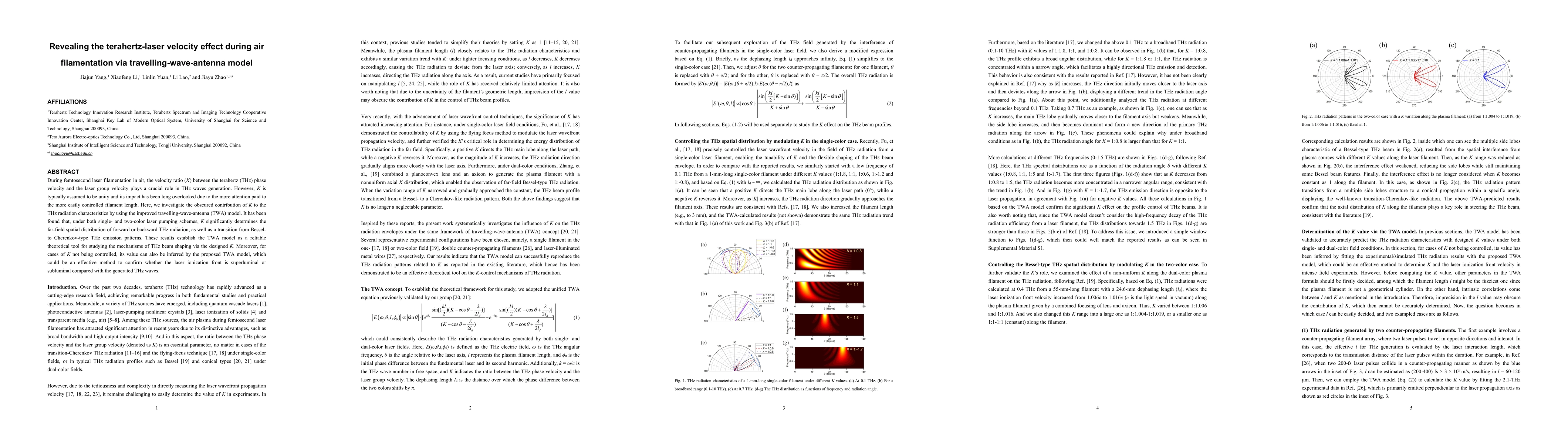 The research utilizes an improved travelling-wave-antenna (TWA) model to investigate the effect of the velocity ratio (K) between terahertz (THz) phase velocity and laser group velocity on THz radiation characteristics during femtosecond laser filamentation in air.