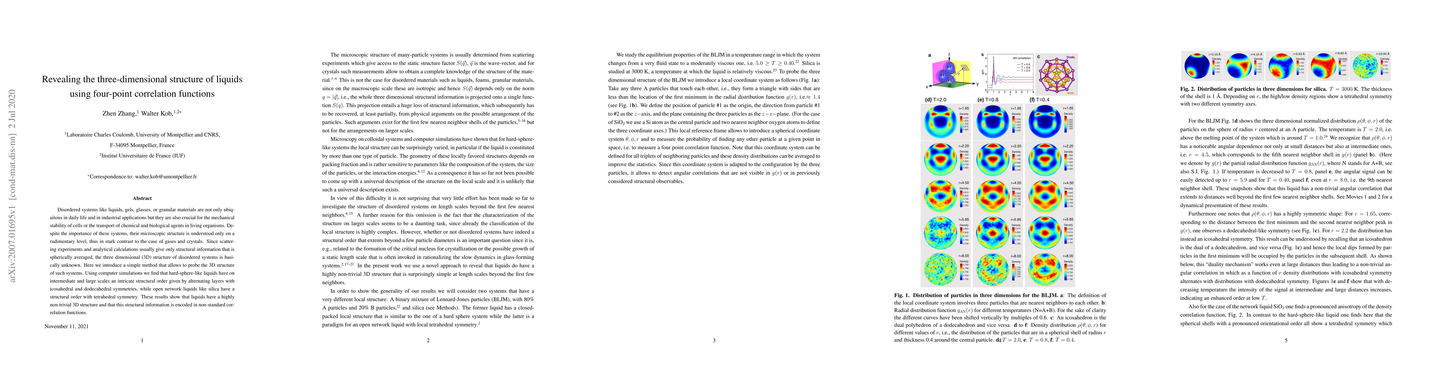 This paper introduces a novel method to reveal the three-dimensional structure of disordered liquids using four-point correlation functions. Through computer simulations, it uncovers intricate structural orders in hard-sphere-like liquids and tetrahedral symmetry in open network liquids like silica, challenging the conventional understanding of liquid structures.