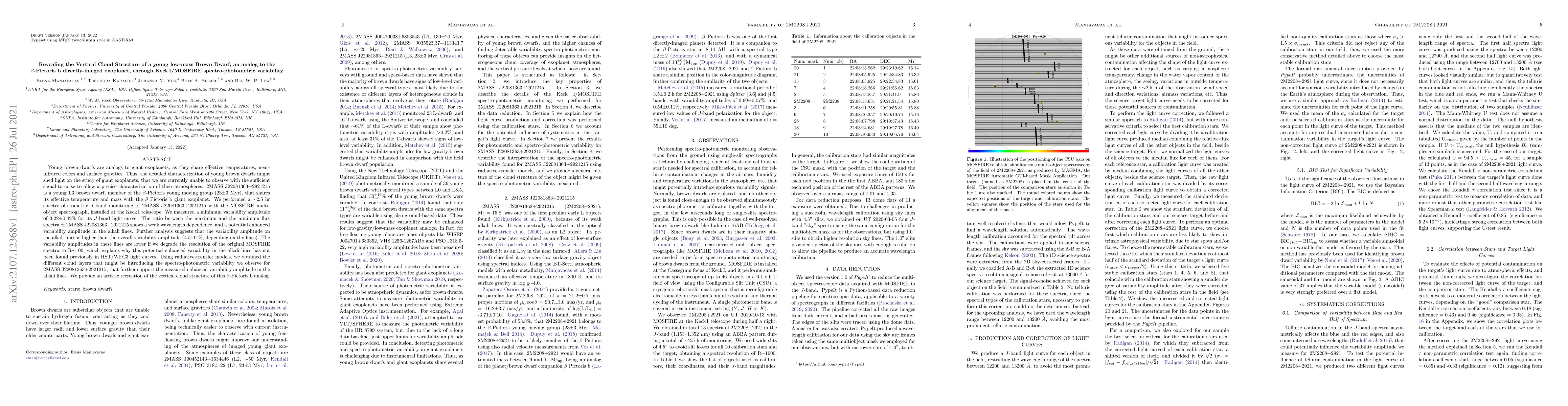 This study uses Keck I/MOSFIRE spectro-photometric monitoring to analyze the variability in a young L3 brown dwarf, 2MASS J22081363+2921215, which serves as an analog to the exoplanet beta Pictoris b. The research reveals a potential enhanced variability in alkali lines, suggesting a complex vertical cloud structure in the atmosphere of the brown dwarf.
