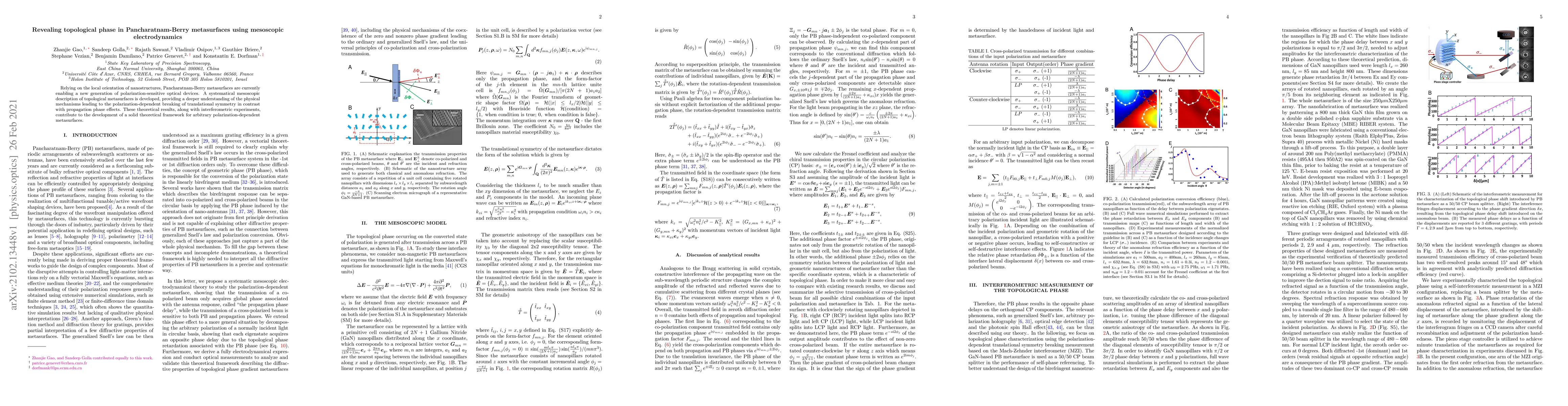 This paper develops a mesoscopic electrodynamics framework to reveal the topological phase in Pancharatnam-Berry metasurfaces, explaining the polarization-dependent breaking of translational symmetry. Experimental validation through interferometric techniques supports the theoretical insights, advancing the understanding of polarization-sensitive optical devices.
