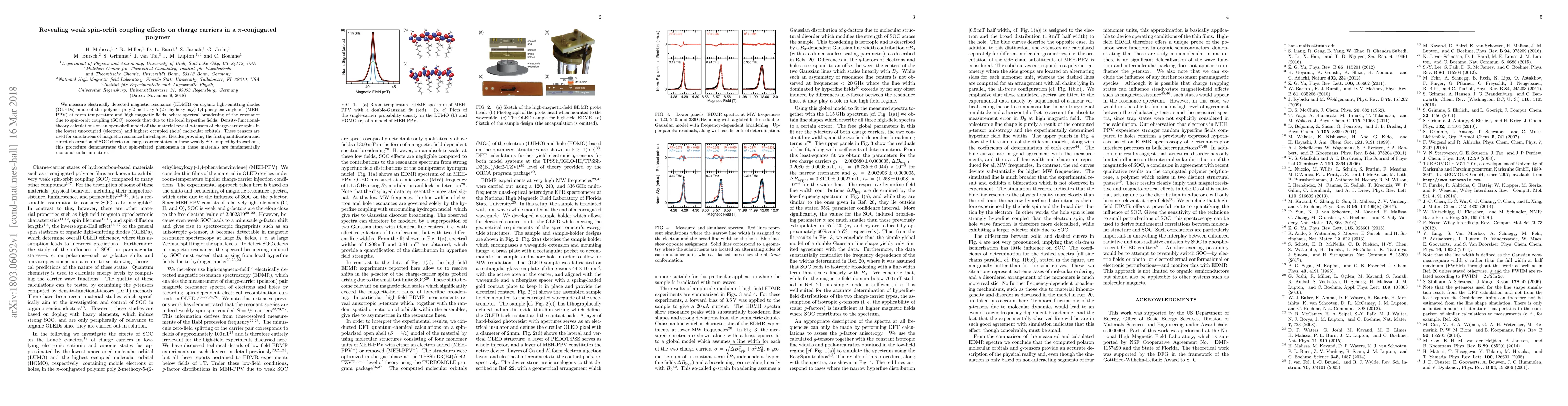 This study uses electrically detected magnetic resonance (EDMR) to reveal the effects of weak spin-orbit coupling (SOC) on charge carriers in a π-conjugated polymer, MEH-PPV, at room temperature. Density-functional-theory calculations and simulations show that SOC influences charge-carrier spins in the polymer's molecular orbitals, providing the first direct observation of these effects in weakly SO-coupled hydrocarbons.