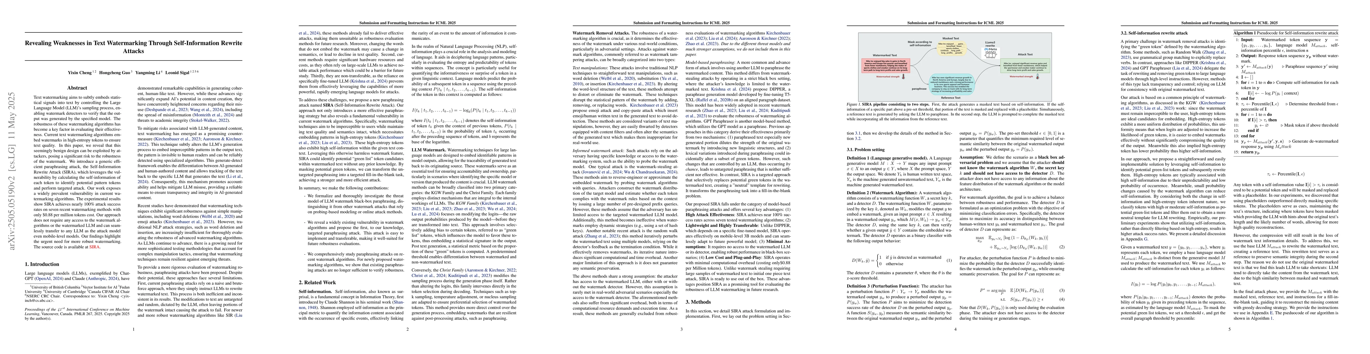 Researchers reveal a vulnerability in text watermarking algorithms, showing that they can be exploited by an efficient attack method called the Self-Information Rewrite Attack (SIRA) with nearly 100% success rates.