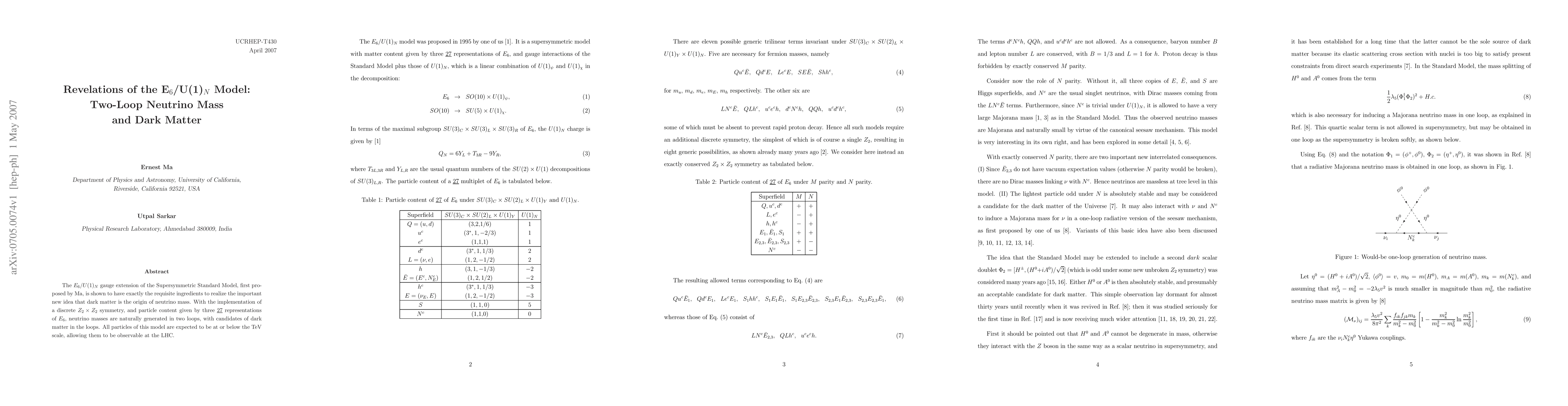 The E_6/U(1)_N gauge extension of the Supersymmetric Standard Model, first proposed by Ma, is shown to have exactly the requisite ingredients to realize the important new idea that dark matter is the origin of neutrino mass. With the implementation of a discrete Z_2 X Z_2 symmetry, and particle content given by three {27} representations of E_6, neutrino masses are naturally generated in two loops, with candidates of dark matter in the loops. All particles of this model are expected to be at or below the TeV scale, allowing them to be observable at the LHC.