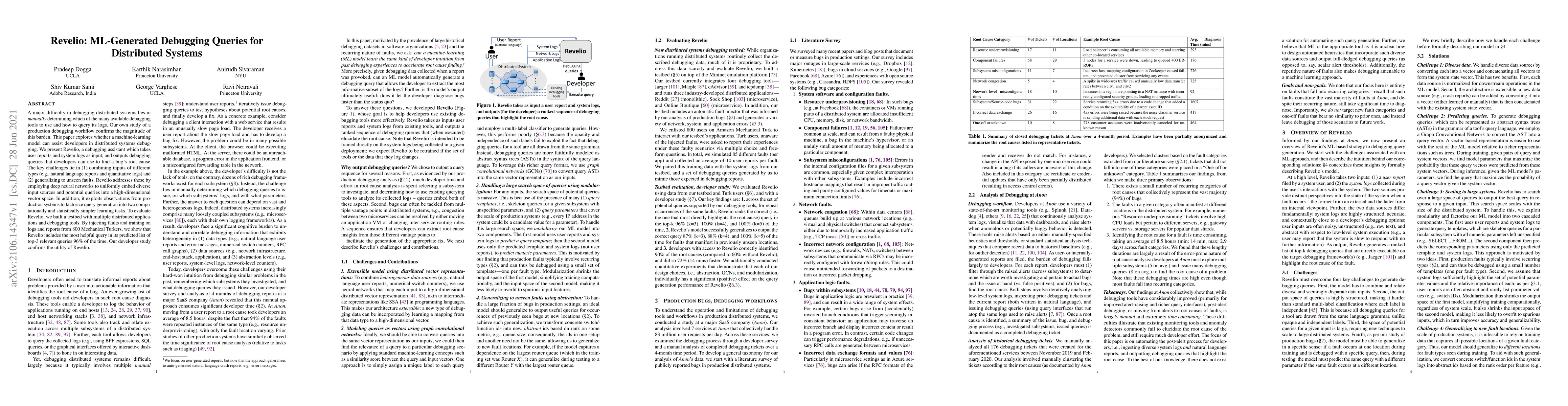 Revelio is a machine-learning model designed to assist developers in debugging distributed systems by generating relevant queries from user reports and system logs. It addresses the challenges of combining diverse input types and generalizing to unseen faults through deep neural networks and factorization techniques, achieving 96% accuracy in predicting the most helpful query.