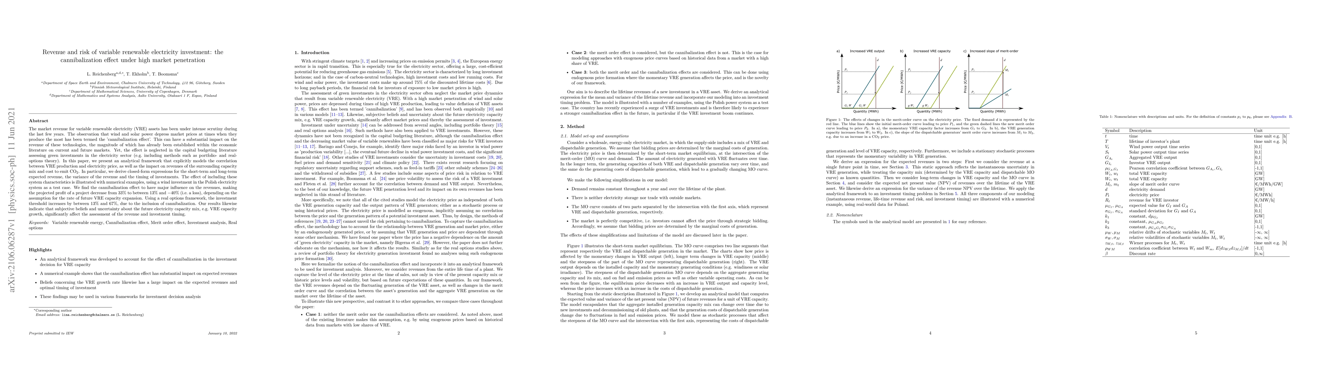 This paper develops an analytical framework to model the "cannibalization effect" of variable renewable electricity (VRE) on market revenues, showing that high VRE penetration can significantly depress prices and reduce projected profits. The study finds that incorporating this effect can increase investment thresholds by up to 67% and highlights the importance of considering future VRE capacity growth in investment assessments.