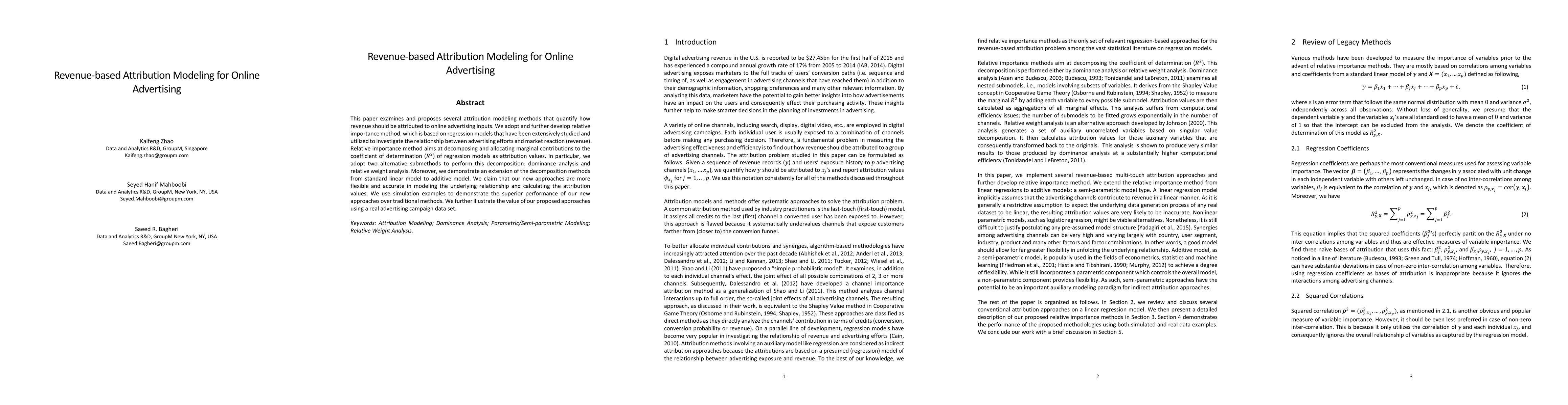 This paper proposes advanced revenue-based attribution modeling methods for online advertising, utilizing dominance analysis and relative weight analysis to decompose and allocate marginal contributions to advertising inputs. The new methods, shown to be more flexible and accurate, outperform traditional approaches through simulation and real-campaign data analysis.