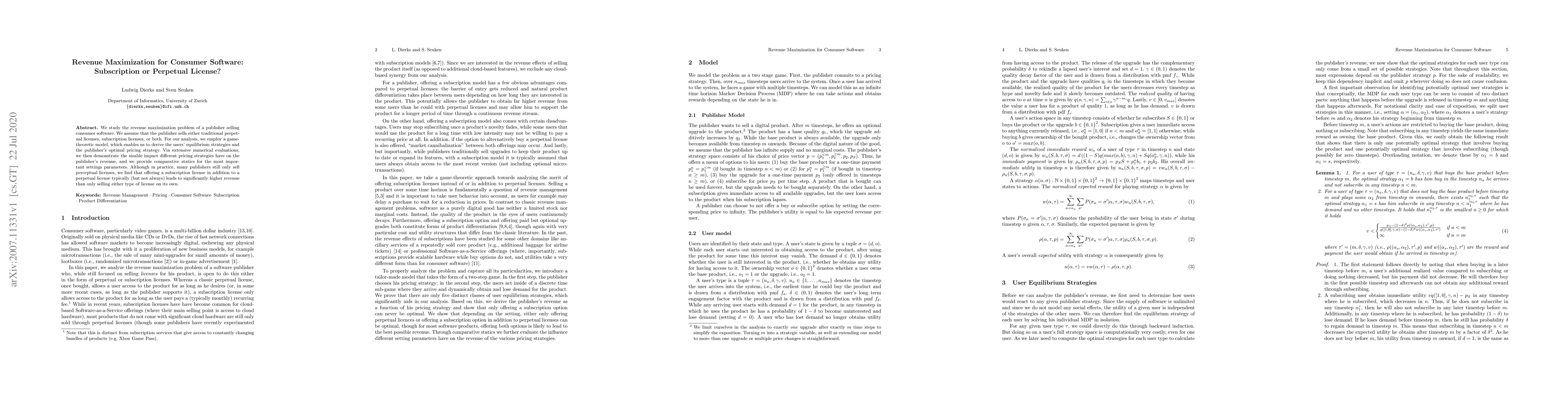 We study the revenue maximization problem of a publisher selling consumer software. We assume that the publisher sells either traditional perpetual licenses, subscription licenses, or both. For our analysis, we employ a game-theoretic model, which enables us to derive the users' equilibrium strategies and the publisher's optimal pricing strategy. Via extensive numerical evaluations, we then demonstrate the sizable impact different pricing strategies have on the publisher's revenue, and we provide comparative statics for the most important settings parameters. Although in practice, many publishers still only sell perceptual licenses, we find that offering a subscription license in addition to a perpetual license typically (but not always) leads to significantly higher revenue than only selling either type of license on its own.