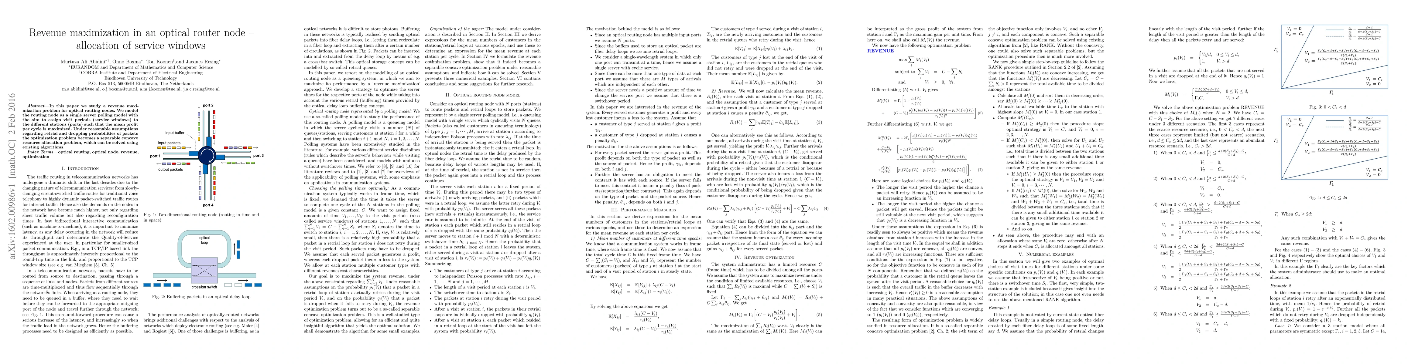 This paper investigates revenue maximization in optical routing nodes by optimizing service window allocation for different ports in a single server polling model. The problem is formulated as a separable concave resource allocation problem, solvable via existing algorithms to maximize mean profit per cycle.