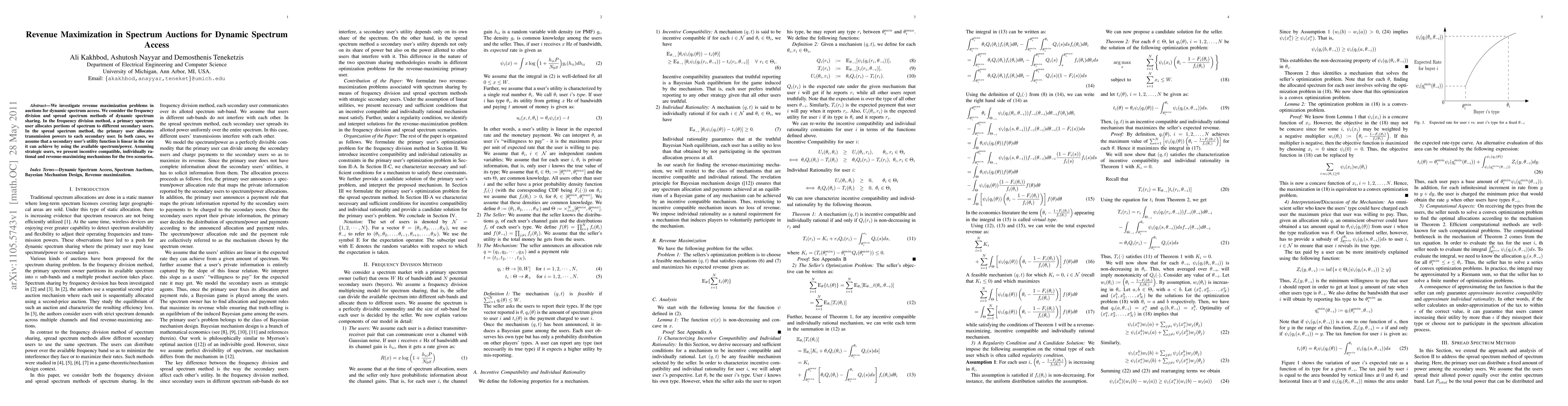 The paper derives incentive-compatible, individually rational, and revenue-maximizing mechanisms for spectrum allocation in dynamic spectrum access systems, considering both frequency division and spread spectrum methods. It assumes strategic secondary users with linear utility functions dependent on the achieved rate.
