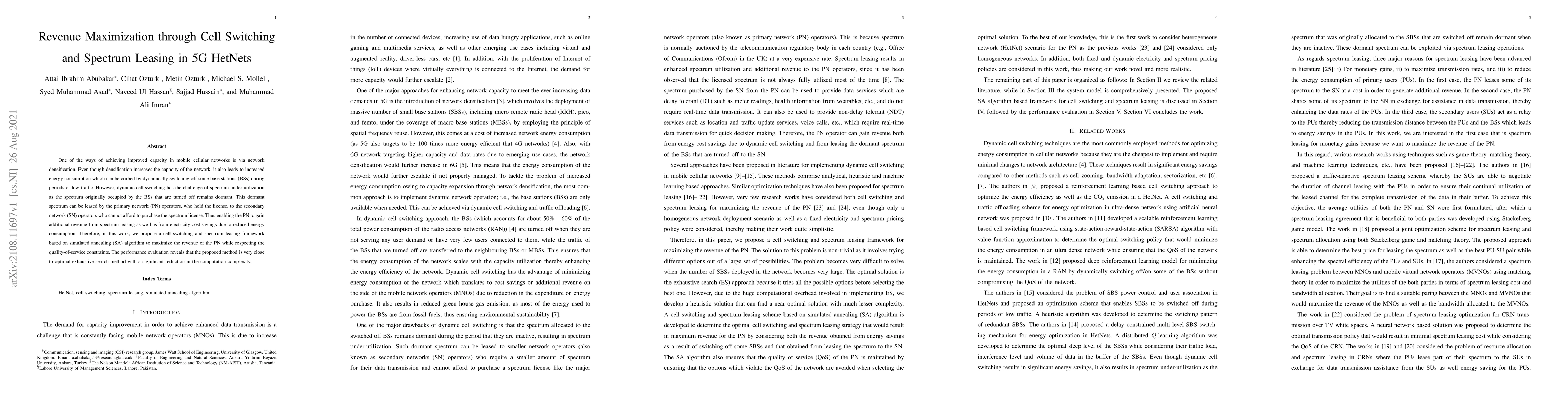 This paper proposes a cell switching and spectrum leasing framework using a simulated annealing algorithm to maximize revenue for primary network operators in 5G HetNets. The approach dynamically turns off base stations during low traffic periods, reducing energy consumption and leasing unused spectrum to secondary network operators, achieving near-optimal revenue while minimizing computational complexity.