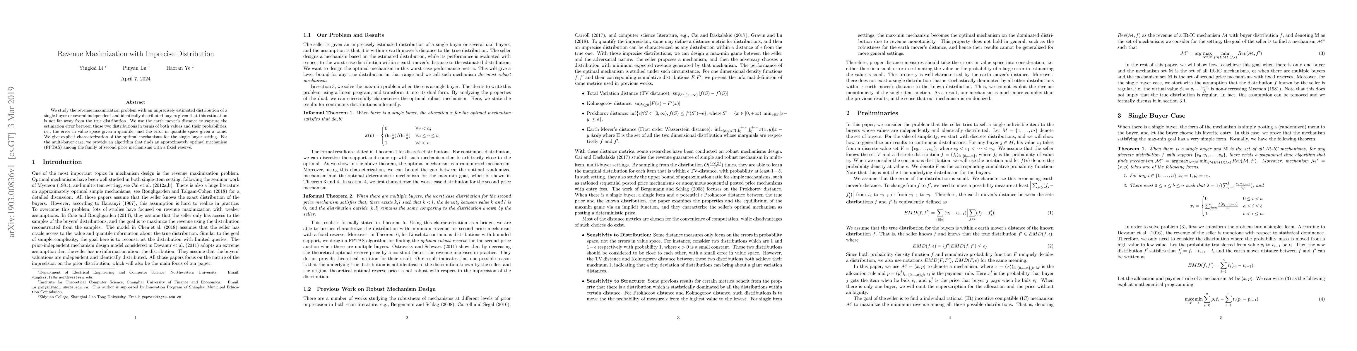 This paper studies revenue maximization with an imprecisely estimated distribution, finding optimal mechanisms for a single buyer and developing an algorithm to find approximately optimal mechanisms for multiple buyers through second-price auctions.