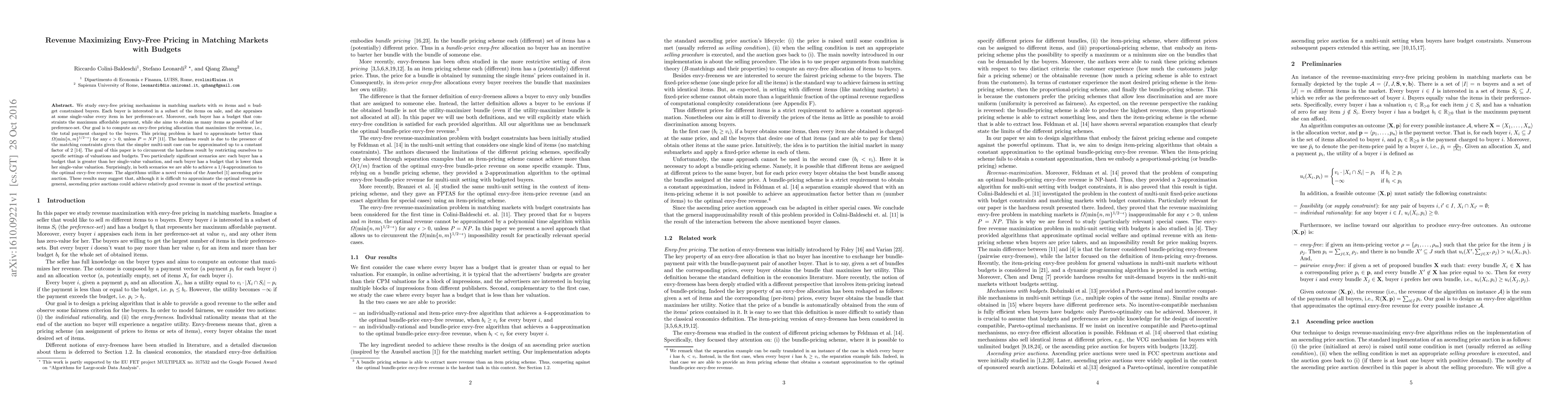 This paper investigates envy-free pricing mechanisms in budget-constrained matching markets, aiming to maximize revenue. Despite the problem's inherent hardness, the authors achieve a 1/4-approximation in specific settings where buyers' budgets either exceed or fall below their valuation, using a modified ascending price auction.