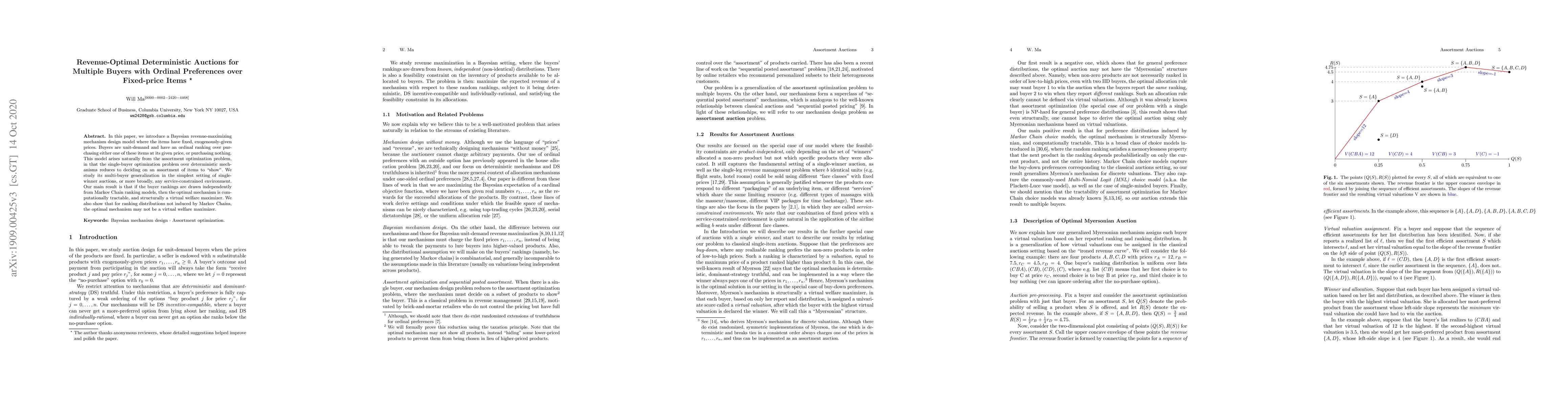 In this paper, we introduce a Bayesian revenue-maximizing mechanism design model where the items have fixed, exogenously-given prices. Buyers are unit-demand and have an ordinal ranking over purchasing either one of these items at its given price, or purchasing nothing. This model arises naturally from the assortment optimization problem, in that the single-buyer optimization problem over deterministic mechanisms reduces to deciding on an assortment of items to "show". We study its multi-buyer generalization in the simplest setting of single-winner auctions, or more broadly, any service-constrained environment. Our main result is that if the buyer rankings are drawn independently from Markov Chain ranking models, then the optimal mechanism is computationally tractable, and structurally a virtual welfare maximizer. We also show that for ranking distributions not induced by Markov Chains, the optimal mechanism may not be a virtual welfare maximizer.
