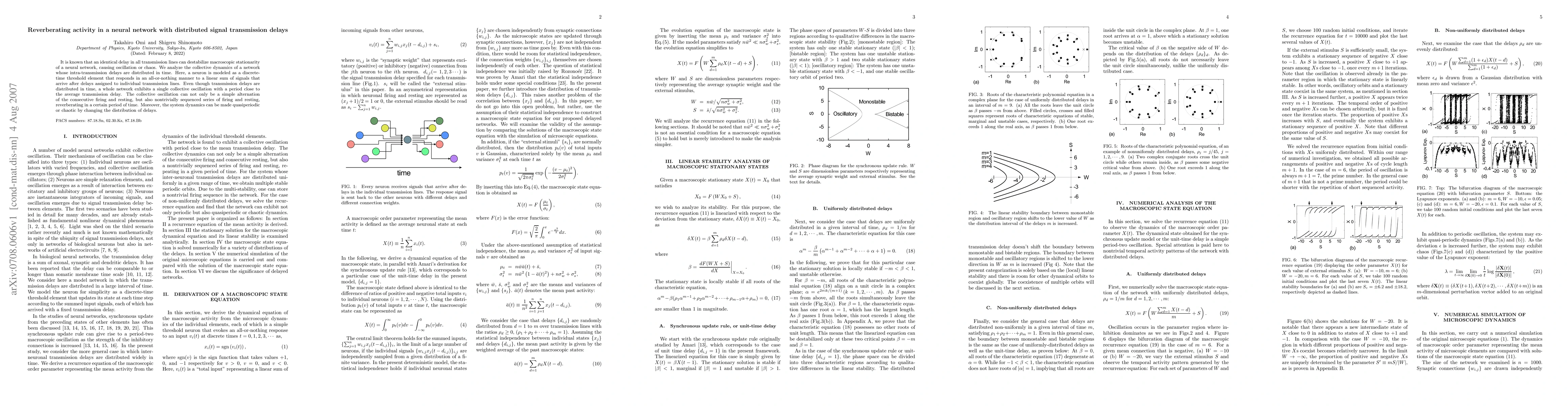 This paper investigates how distributed transmission delays in a neural network affect its collective dynamics, finding that despite varied delays, the network can exhibit a single collective oscillation. The study reveals that the network can display complex reverberating patterns and that altering the delay distribution can lead to quasiperiodic or chaotic dynamics.