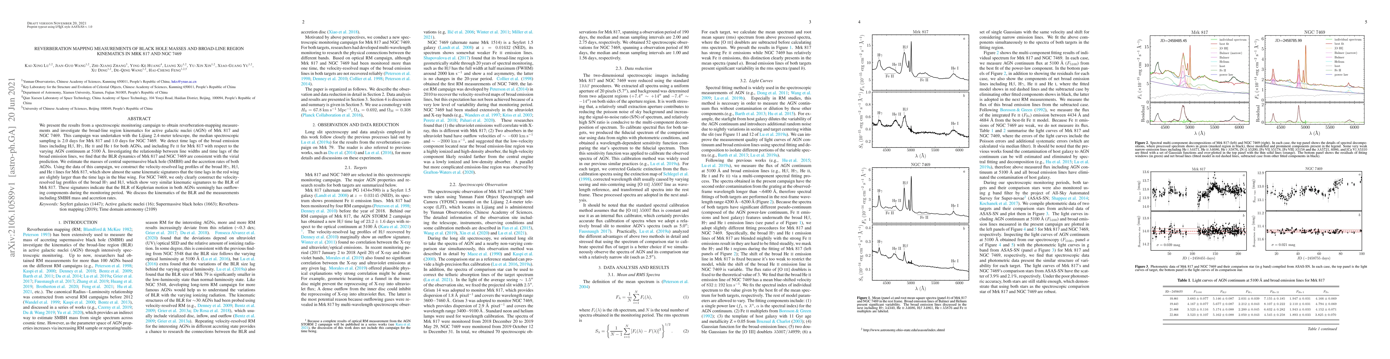 This paper reports on reverberation-mapping measurements from spectroscopic monitoring of AGN Mrk 817 and NGC 7469, revealing time lags between broad emission lines and the AGN continuum. The study estimates the masses of central supermassive black holes and finds BLR dynamics consistent with virial predictions, indicating outflowing components in the broad-line regions during the monitoring period.