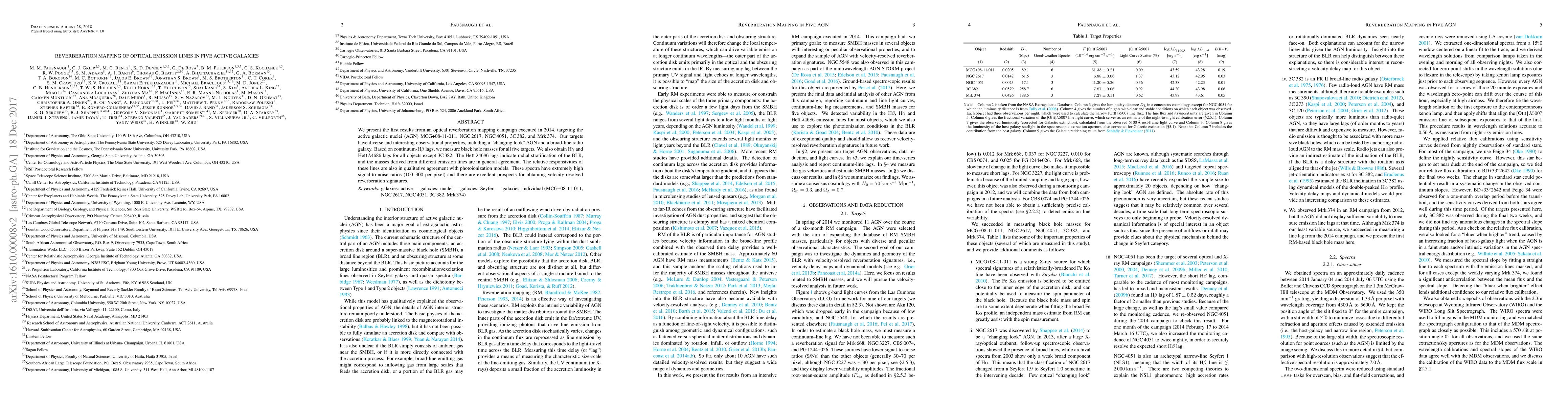 We present the first results from an optical reverberation mapping campaign executed in 2014, targeting the active galactic nuclei (AGN) MCG+08-11-011, NGC 2617, NGC 4051, 3C 382, and Mrk 374. Our targets have diverse and interesting observational properties, including a "changing look" AGN and a broad-line radio galaxy. Based on continuum-H$\beta$ lags, we measure black hole masses for all five targets. We also obtain H$\gamma$ and He{\sc ii}\,$\lambda 4686$ lags for all objects except 3C 382. The He{\sc ii}\,$\lambda 4686$ lags indicate radial stratification of the BLR, and the masses derived from different emission lines are in general agreement. The relative responsivities of these lines are also in qualitative agreement with photoionization models. These spectra have extremely high signal-to-noise ratios (100--300 per pixel) and there are excellent prospects for obtaining velocity-resolved reverberation signatures.
