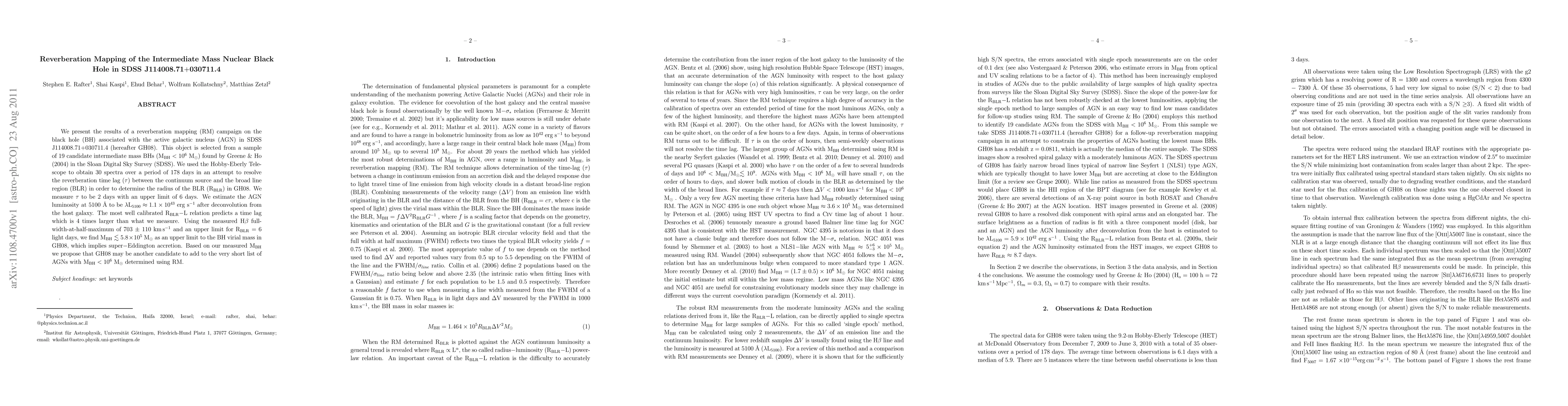This paper reports on reverberation mapping of the AGN in SDSS J114008.71+030711.4, revealing a time lag of 2 days between continuum and broad line region, suggesting a black hole mass below 5.8 x 10^5 Msun, indicating potential super-Eddington accretion.