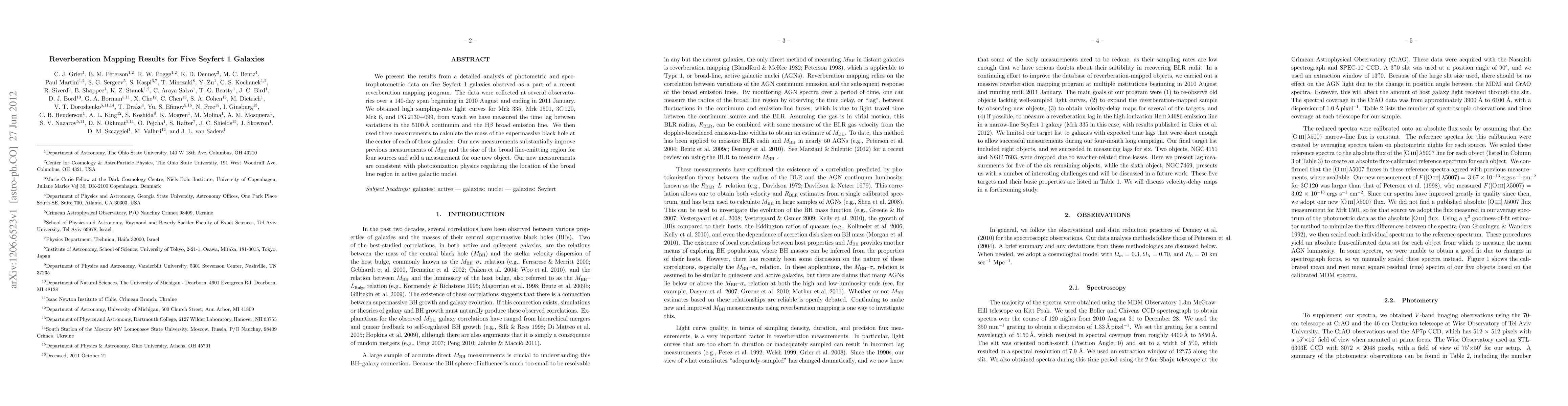 This paper reports on reverberation mapping results for five Seyfert 1 galaxies, revealing improved measurements of supermassive black hole masses and broad line-emitting region sizes, consistent with photoionization models. The study utilized high-sampling-rate light curves over a 140-day period.