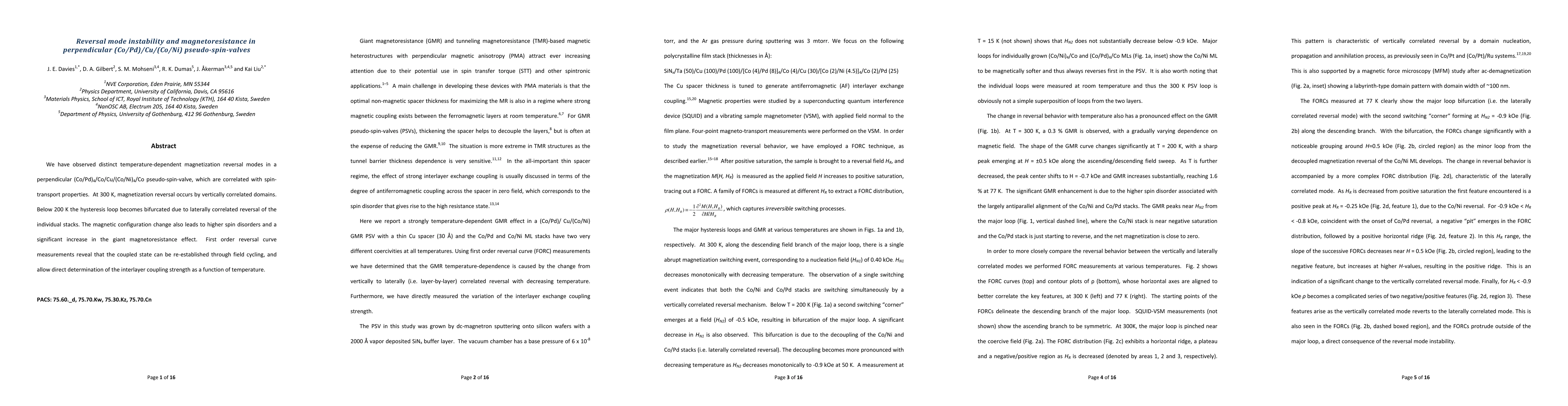 This study investigates temperature-dependent magnetization reversal modes in perpendicular pseudo-spin-valves, revealing distinct behaviors above and below 200 K, with significant increases in magnetoresistance and spin disorder at lower temperatures. First order reversal curve measurements provide insight into interlayer coupling strength.