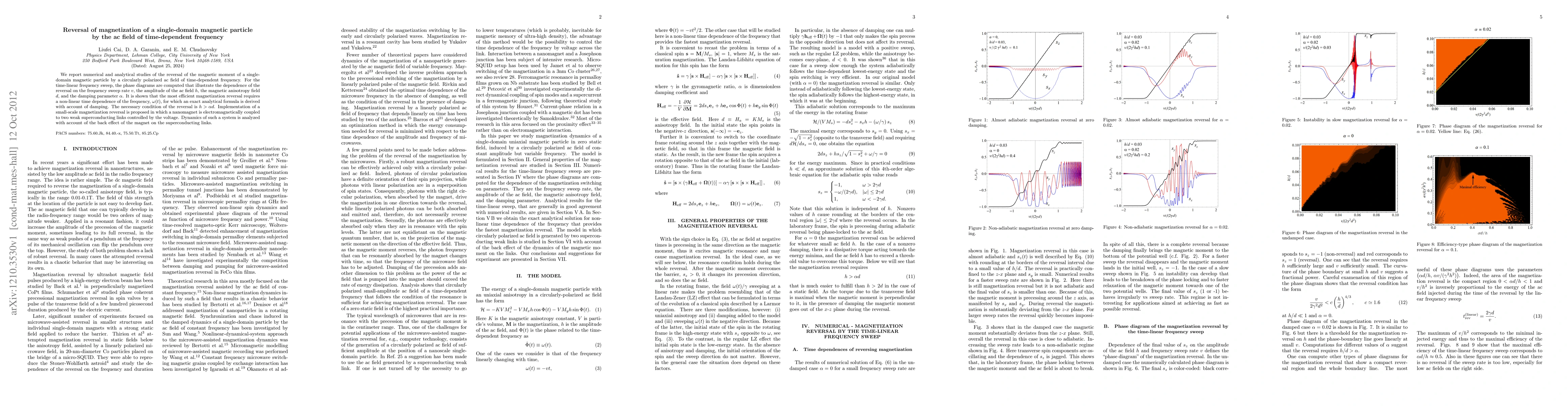 This paper investigates the reversal of magnetization in a single-domain magnetic particle using a time-dependent frequency ac field. It finds that non-linear frequency dependence and specific conditions on the field amplitude and damping parameters are necessary for efficient reversal, proposing a small-scale nanomagnet system with superconducting links for practical implementation.