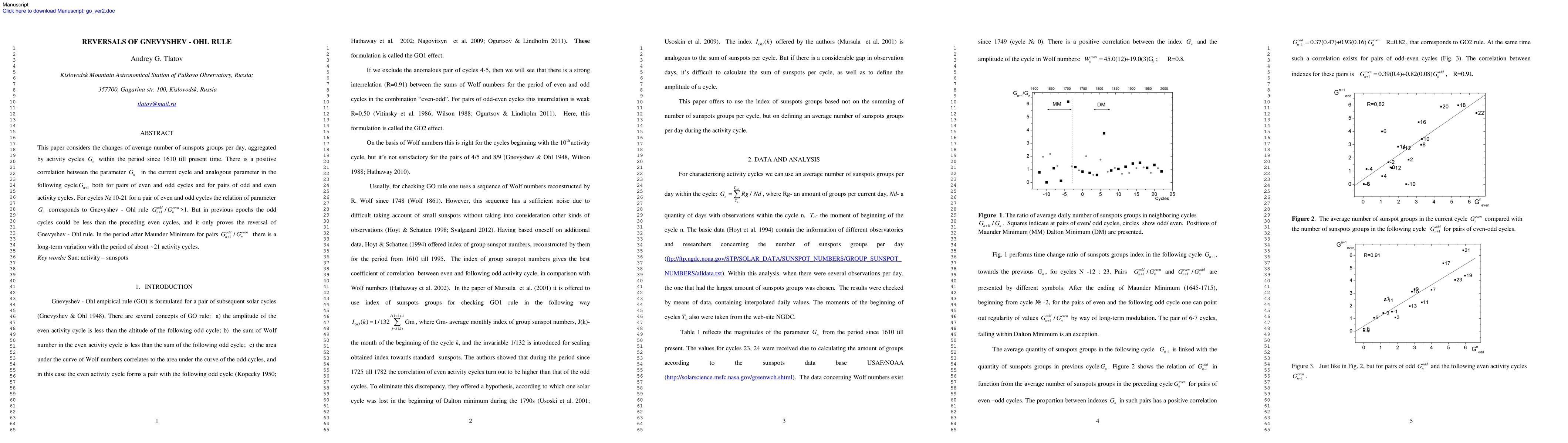 This paper considers the changes of average number of sunspots groups per day, aggregated by activity cycles Gn within the period since 1610 till present time. The relation of parameter Gn of the preceding and the following activity cycles has a long-term variation with the period of about 20 activity cycles. There is a positive correlation between the parameter Gn in the current cycle and analogous parameter in the following cycle Gn+1. For cycles N 10-21 for a pair of even and odd cycles the relation of parameter Gn corresponds to Gnevyshev-Ohl rule Godd/Geven>1. But in previous epochs the odd cycles could be less than the preceding even cycles, and it only proves the reversal of Gnevyshev-Ohl rule.