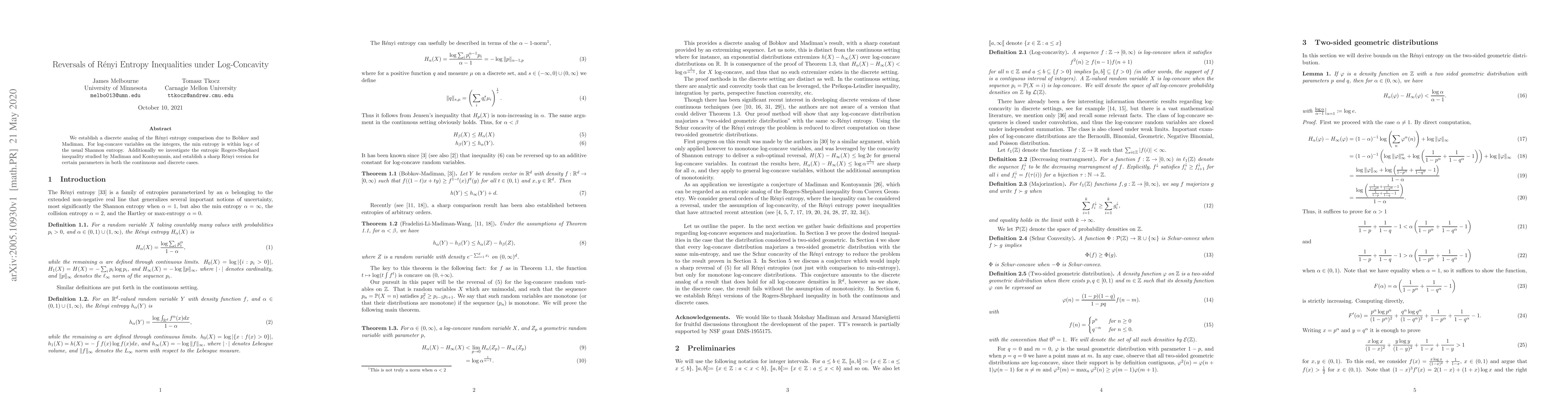 We establish a discrete analog of the R\'enyi entropy comparison due to Bobkov and Madiman. For log-concave variables on the integers, the min entropy is within log e of the usual Shannon entropy. Additionally we investigate the entropic Rogers-Shephard inequality studied by Madiman and Kontoyannis, and establish a sharp R\'enyi version for certain parameters in both the continuous and discrete cases