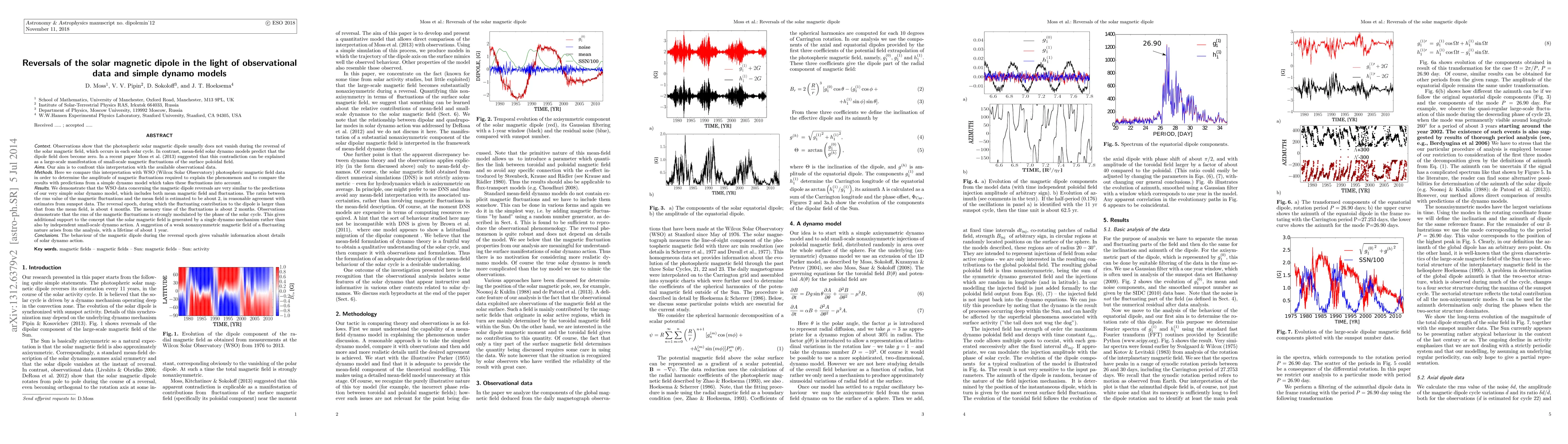 This study examines solar magnetic dipole reversals, finding that observational data aligns with a simple dynamo model incorporating magnetic fluctuations. The research estimates the ratio of fluctuation to mean field strength at around 2, suggesting a single dynamo mechanism for the solar field, rather than multiple small-scale actions. The analysis also hints at a weak, fluctuating nonaxymmetric magnetic field with a yearly lifetime.