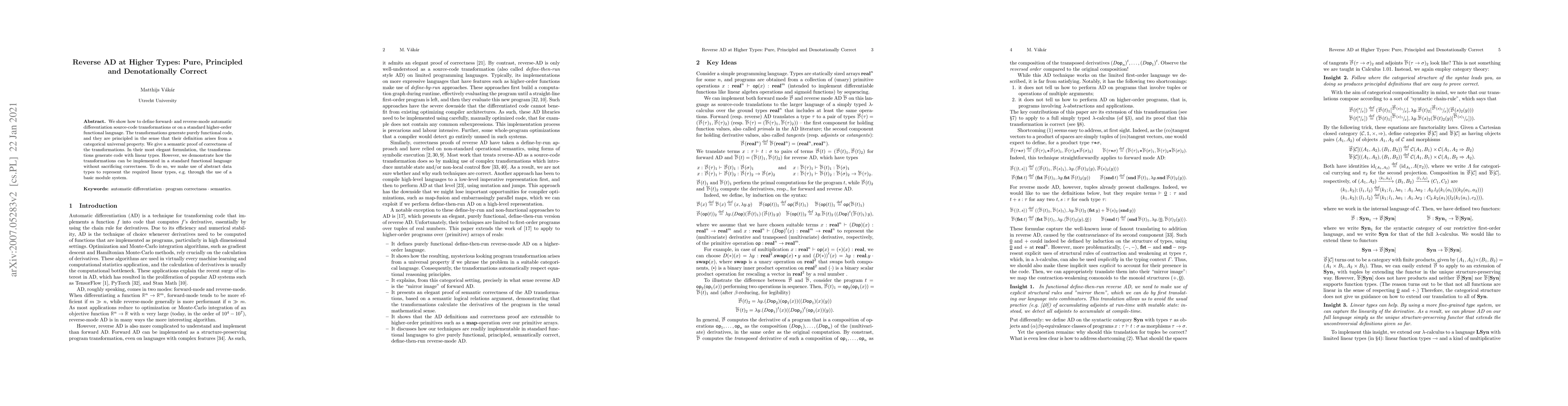 This paper proposes a categorical framework for defining forward- and reverse-mode automatic differentiation in a higher-order functional language, ensuring principled and denotational correctness, and demonstrates how to implement these transformations while maintaining accuracy. It leverages abstract data types and linear types to achieve these goals.