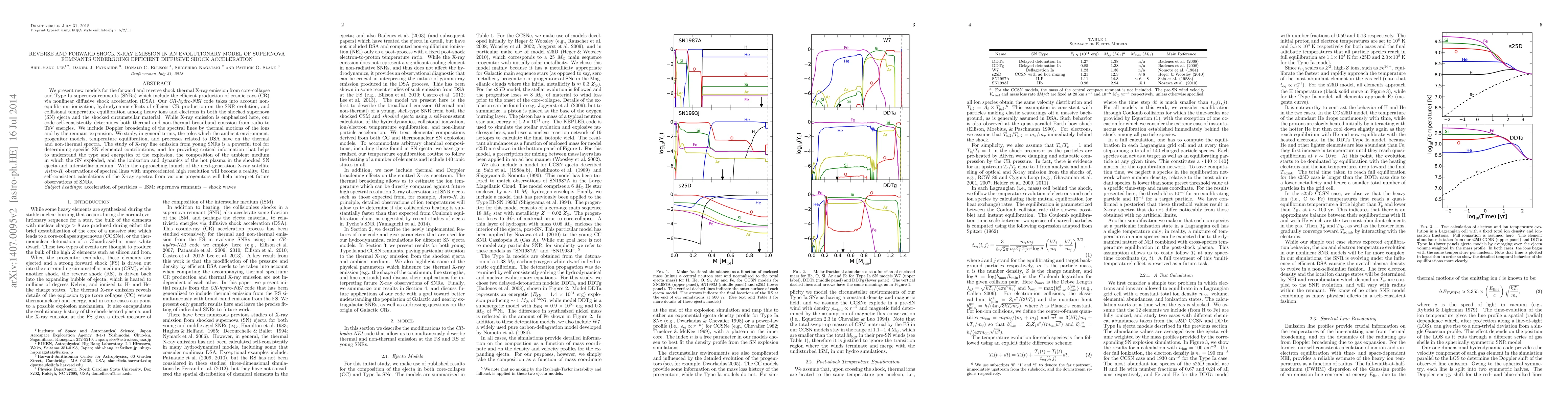 We present new models for the forward and reverse shock thermal X-ray emission from core-collapse and Type Ia supernova remnants (SNRs) which include the efficient production of cosmic rays via non-linear diffusive shock acceleration (DSA). Our CR-hydro-NEI code takes into account non-equilibrium ionization (NEI), hydrodynamic effects of efficient CR production on the SNR evolution, and collisional temperature equilibration among heavy ions and electrons in both the shocked supernova (SN) ejecta and the shocked circumstellar material. While X-ray emission is emphasized here, our code self-consistently determines both thermal and non-thermal broadband emission from radio to TeV energies. We include Doppler broadening of the spectral lines by thermal motions of the ions and by the remnant expansion. We study, in general terms, the roles which the ambient environment, progenitor models, temperature equilibration, and processes related to DSA have on the thermal and non-thermal spectra. The study of X-ray line emission from young SNRs is a powerful tool for determining specific SN elemental contributions, and for providing critical information that helps to understand the type and energetics of the explosion, the composition of the ambient medium in which the SN exploded, and the ionization and dynamics of the hot plasma in the shocked SN ejecta and interstellar medium. With the approaching launch of the next-generation X-ray satellite Astro-H, observations of spectral lines with unprecedented high resolution will become a reality. Our self-consistent calculations of the X-ray spectra from various progenitors will help interpret future observations of SNRs.