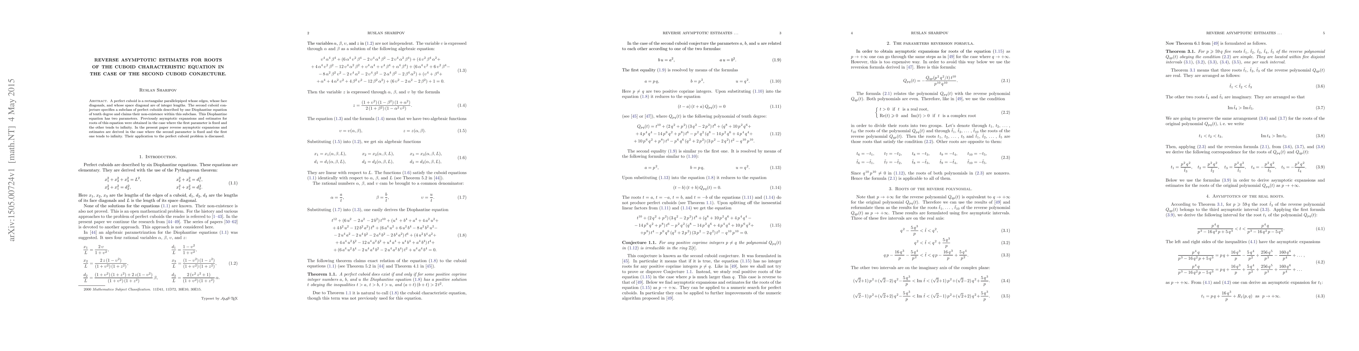 A perfect cuboid is a rectangular parallelepiped whose edges, whose face diagonals, and whose space diagonal are of integer lengths. The second cuboid conjecture specifies a subclass of perfect cuboids described by one Diophantine equation of tenth degree and claims their non-existence within this subclass. This Diophantine equation has two parameters. Previously asymptotic expansions and estimates for roots of this equation were obtained in the case where the first parameter is fixed and the other tends to infinity. In the present paper reverse asymptotic expansions and estimates are derived in the case where the second parameter is fixed and the first one tends to infinity. Their application to the perfect cuboid problem is discussed.