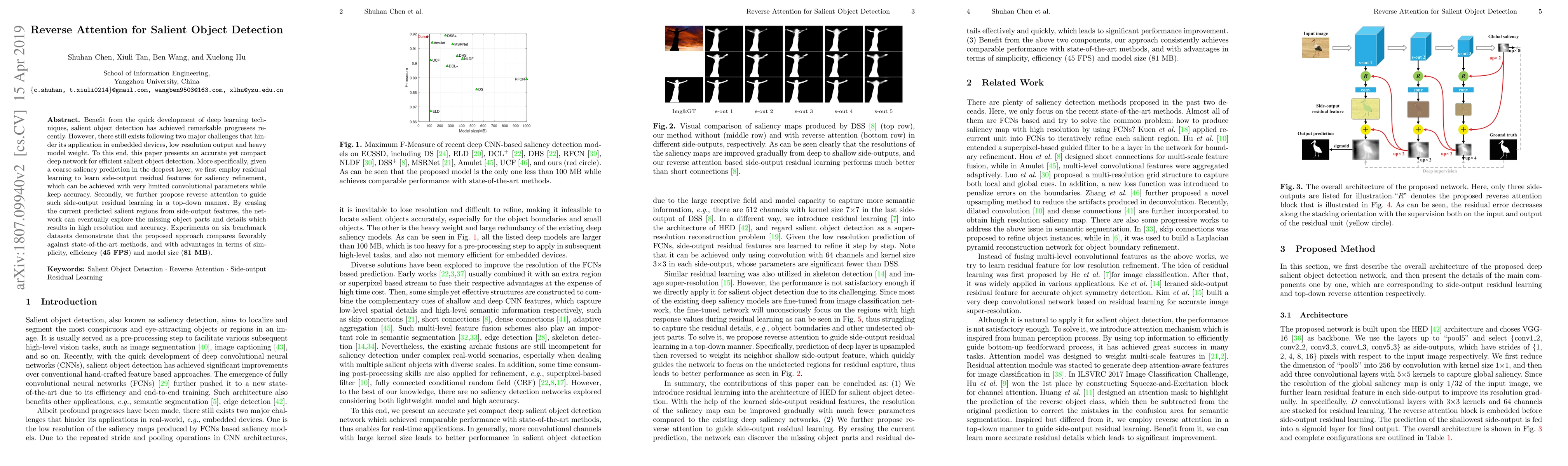 This paper presents an efficient deep network for salient object detection using residual learning and reverse attention to refine saliency predictions, achieving high resolution and accuracy while maintaining model simplicity and efficiency. The proposed method outperforms state-of-the-art techniques with a model size of 81 MB and a processing speed of 45 FPS.