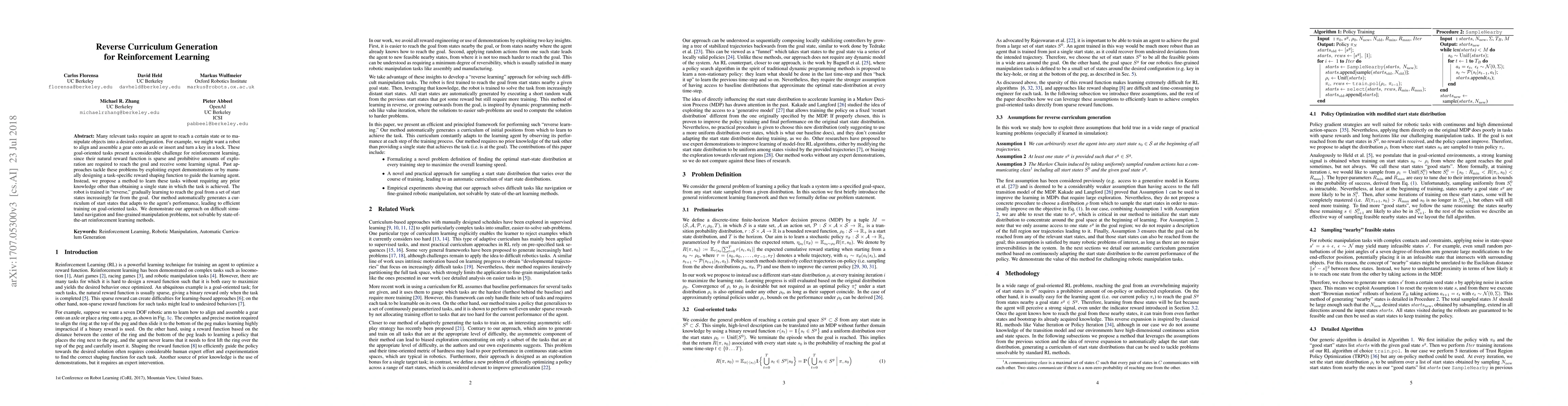 This paper proposes a reverse curriculum generation method for reinforcement learning to tackle goal-oriented tasks without prior knowledge, training the agent by gradually approaching the goal from various start states. The method dynamically adapts the curriculum based on the agent's performance, enabling efficient training for complex navigation and manipulation tasks.