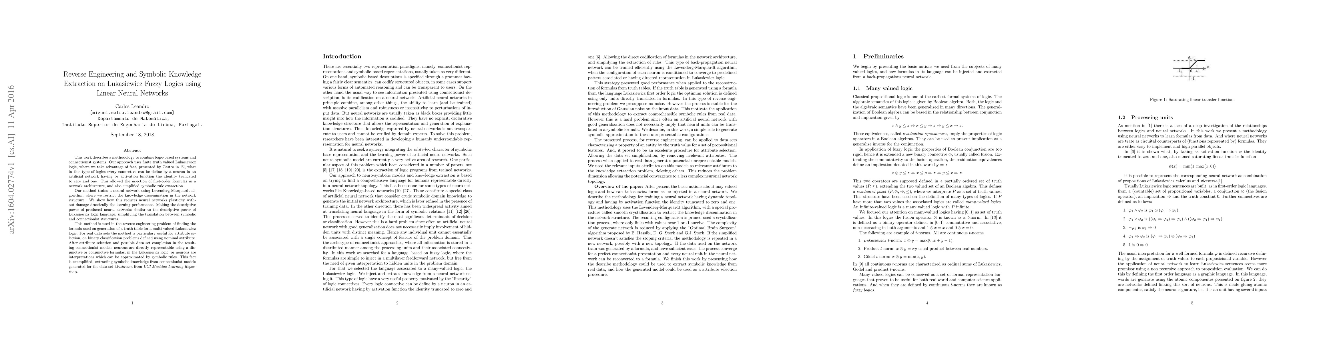 This paper proposes a method to merge logic-based systems with neural networks by using {\L}ukasiewicz fuzzy logic, where each connective is represented by a neuron. The trained neural network, using the Levenshtein-Marquardt algorithm, facilitates reverse engineering and symbolic knowledge extraction, demonstrating its effectiveness in attribute selection for binary classification problems.