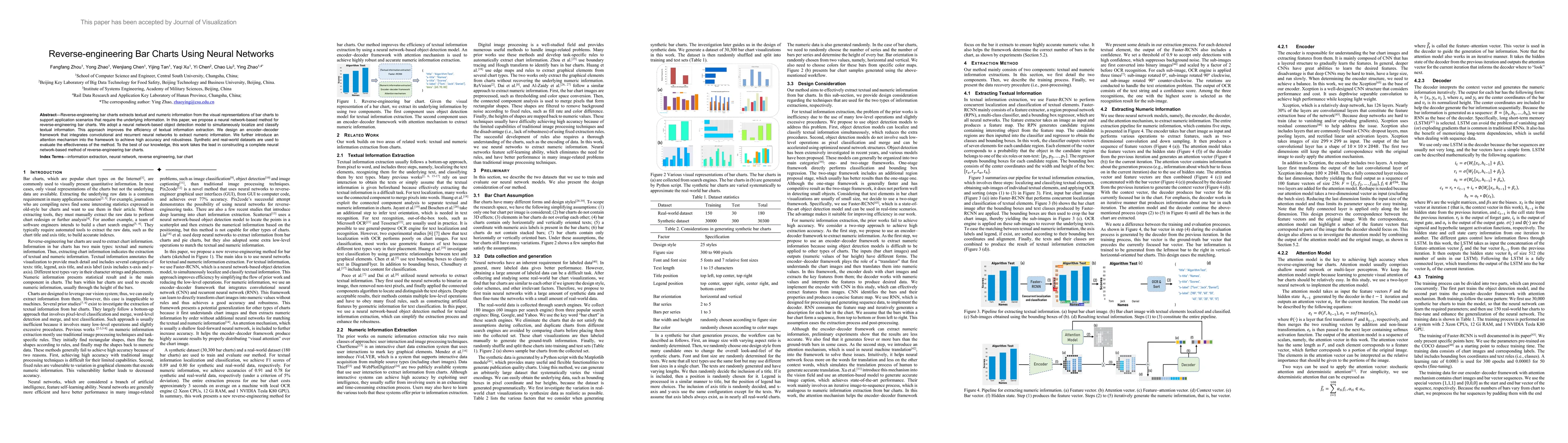 This paper proposes a neural network-based method for reverse-engineering bar charts to extract textual and numeric information efficiently. It uses an object detection model for textual information and an encoder-decoder framework with attention for numeric data, demonstrating effectiveness on synthetic and real datasets.