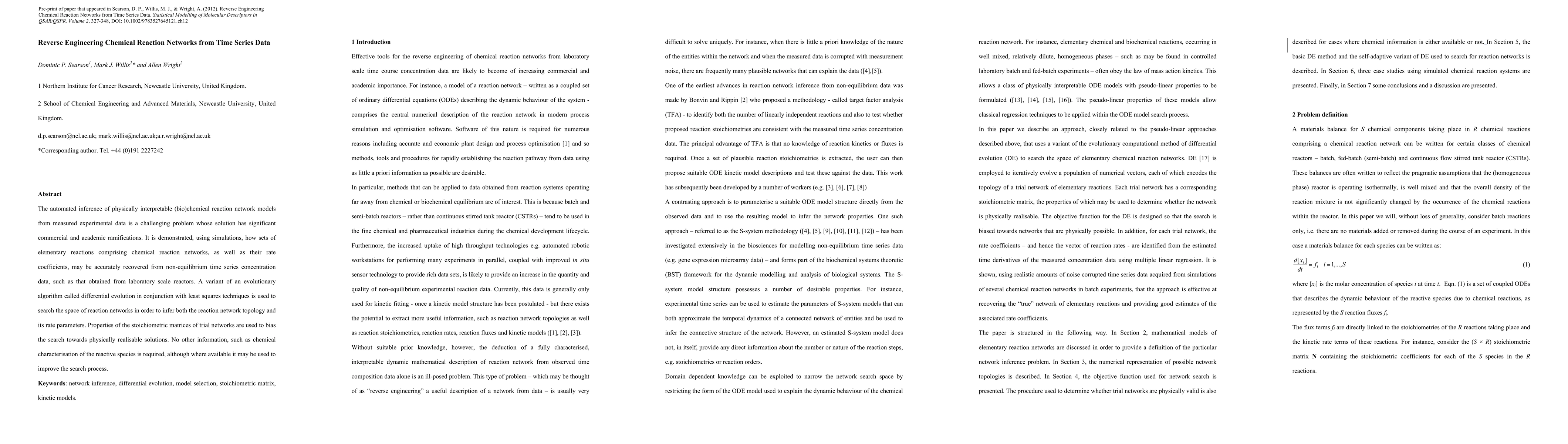 The automated inference of physically interpretable (bio)chemical reaction network models from measured experimental data is a challenging problem whose solution has significant commercial and academic ramifications. It is demonstrated, using simulations, how sets of elementary reactions comprising chemical reaction networks, as well as their rate coefficients, may be accurately recovered from non-equilibrium time series concentration data, such as that obtained from laboratory scale reactors. A variant of an evolutionary algorithm called differential evolution in conjunction with least squares techniques is used to search the space of reaction networks in order to infer both the reaction network topology and its rate parameters. Properties of the stoichiometric matrices of trial networks are used to bias the search towards physically realisable solutions. No other information, such as chemical characterisation of the reactive species is required, although where available it may be used to improve the search process.