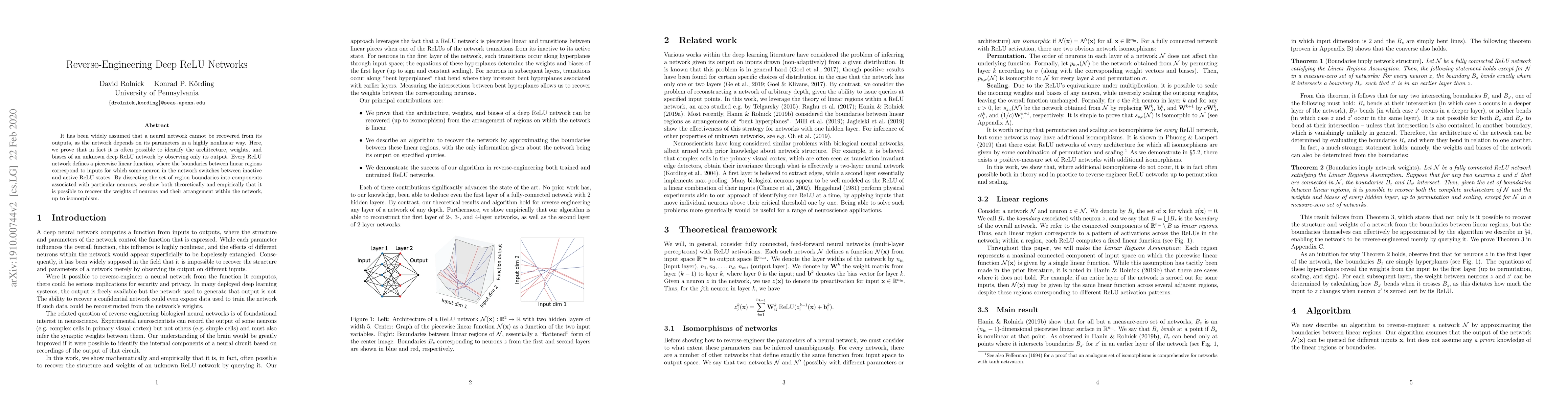 This paper demonstrates that it is feasible to reverse-engineer the architecture, weights, and biases of an unknown deep ReLU network by analyzing its outputs. The authors show theoretically and empirically that the network's piecewise linear function and the boundaries between its linear regions can be used to reconstruct the network's structure and parameters.