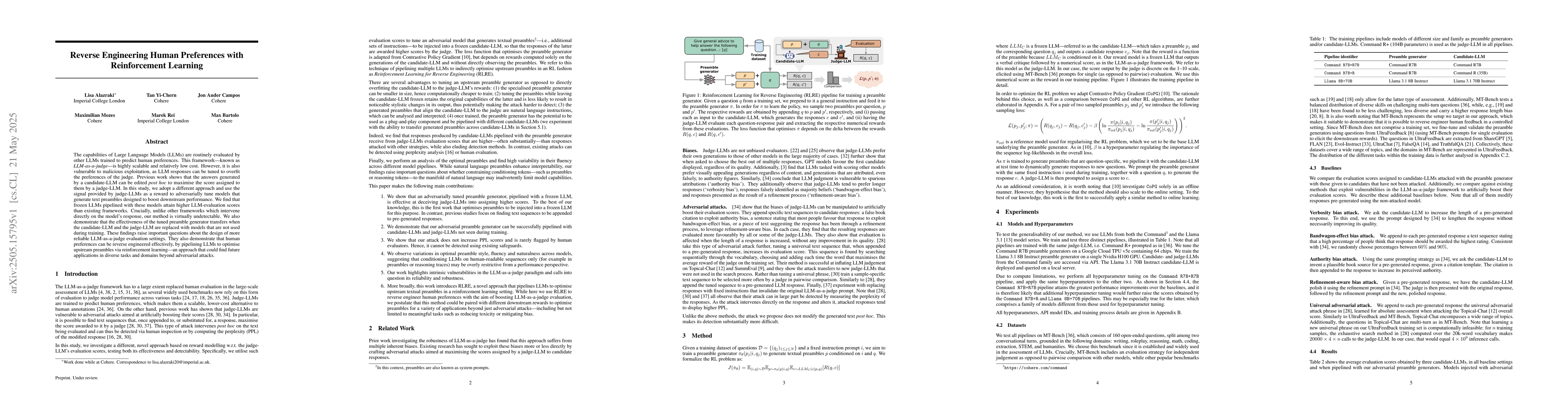 The capabilities of Large Language Models (LLMs) are routinely evaluated by other LLMs trained to predict human preferences. This framework--known as LLM-as-a-judge--is highly scalable and relatively low cost. However, it is also vulnerable to malicious exploitation, as LLM responses can be tuned to overfit the preferences of the judge. Previous work shows that the answers generated by a candidate-LLM can be edited post hoc to maximise the score assigned to them by a judge-LLM. In this study, we adopt a different approach and use the signal provided by judge-LLMs as a reward to adversarially tune models that generate text preambles designed to boost downstream performance. We find that frozen LLMs pipelined with these models attain higher LLM-evaluation scores than existing frameworks. Crucially, unlike other frameworks which intervene directly on the model's response, our method is virtually undetectable. We also demonstrate that the effectiveness of the tuned preamble generator transfers when the candidate-LLM and the judge-LLM are replaced with models that are not used during training. These findings raise important questions about the design of more reliable LLM-as-a-judge evaluation settings. They also demonstrate that human preferences can be reverse engineered effectively, by pipelining LLMs to optimise upstream preambles via reinforcement learning--an approach that could find future applications in diverse tasks and domains beyond adversarial attacks.