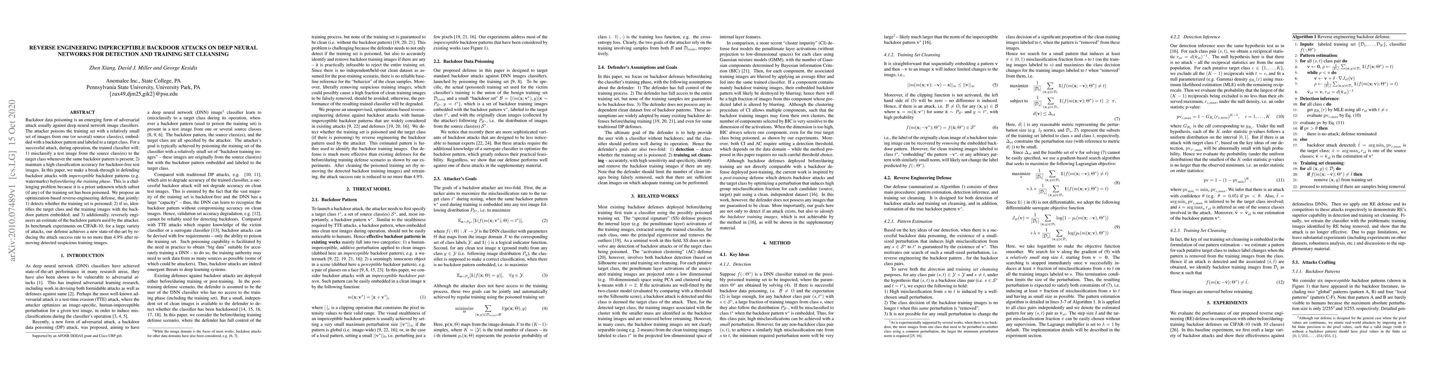 This paper introduces a novel optimization-based defense against backdoor attacks on deep neural networks, capable of detecting and identifying poisoned training images and estimating the backdoor pattern, significantly reducing the attack success rate to 4.9% after cleansing the training set. The method addresses the challenge of detecting unknown poisoned subsets in the training data.