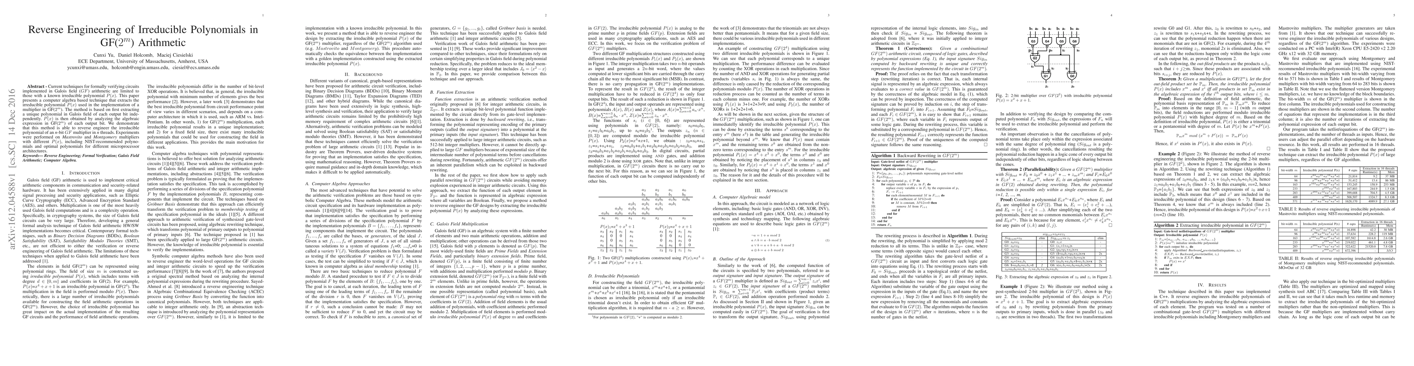 This paper introduces a computer algebra method to reverse engineer irreducible polynomials used in GF(2^m) arithmetic for circuit verification, extracting the unique polynomial P(x) by analyzing the algebraic expressions of each output bit, and demonstrates its application on Mastrovito and Montgomery multipliers.