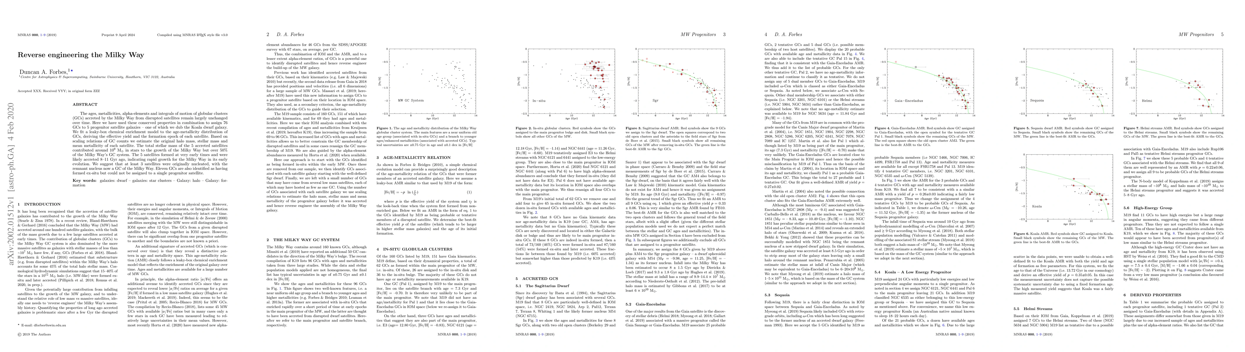 The ages, metallicities, alpha-elements and integrals of motion of globular clusters (GCs) accreted by the Milky Way from disrupted satellites remain largely unchanged over time. Here we have used these conserved properties in combination to assign 76 GCs to 5 progenitor satellite galaxies -- one of which we dub the Koala dwarf galaxy. We fit a leaky-box chemical enrichment model to the age-metallicity distribution of GCs, deriving the effective yield and the formation epoch of each satellite. Based on scaling relations of GC counts we estimate the original halo mass, stellar mass and mean metallicity of each satellite. The total stellar mass of the 5 accreted satellites contributed around 10$^{9}$ M$_{\odot}$ in stars to the growth of the Milky Way but over 50\% of the Milky Way's GC system. The 5 satellites formed at very early times and were likely accreted 8--11 Gyr ago, indicating rapid growth for the Milky Way in its early evolution. We suggest that at least 3 satellites were originally nucleated, with the remnant nucleus now a GC of the Milky Way. Eleven GCs are also identified as having formed ex-situ but could not be assigned to a single progenitor satellite.