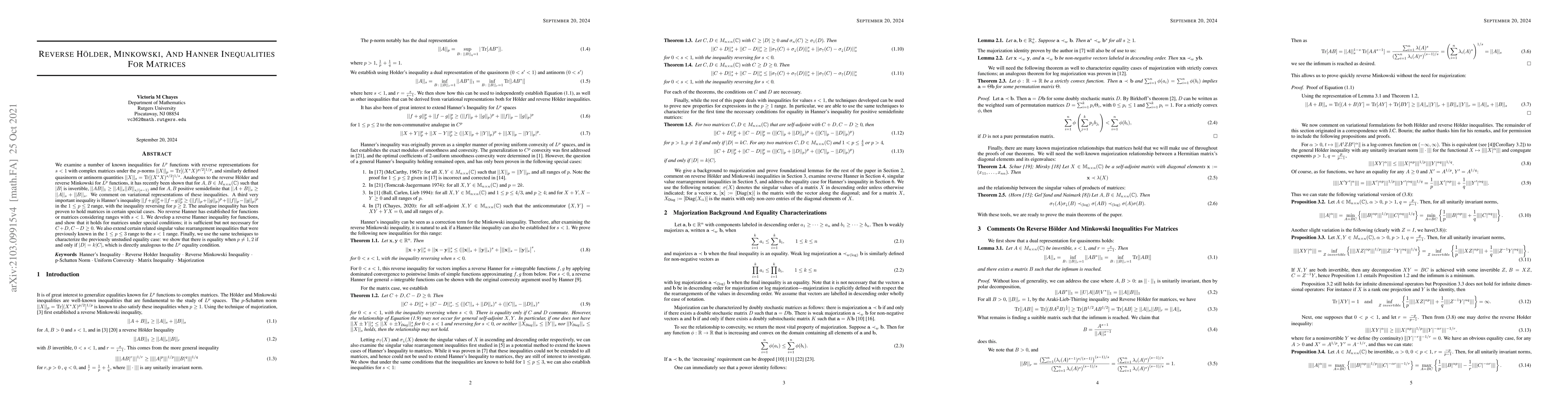 We examine a number of known inequalities for $L^p$ functions with reverse representations for $s<1$ with complex matrices under the $p$-norms $||X||_p=\text{Tr}[(X^\ast X)^{p/2}]^{1/p}$, and similarly defined quasinorm or antinorm quantities $||X||_s=\text{Tr}[(X^\ast X)^{s/2}]^{1/s}$. Analogous to the reverse H\"{o}lder and reverse Minkowski for $L^p$ functions, it has recently been shown that for $A,B\in M_{n\times n}(\mathbb{C})$ such that $|B|$ is invertible, $||AB||_1\geq ||A||_{s}||B||_{s/(s-1)}$ and for $A,B$ positive semidefinite that $||A+B||_s\geq ||A||_s+||B||_s$. We comment on variational representations of these inequalities. A third very important inequality is Hanner's inequality $||f+g||_p^p+||f-g||_p^p\geq(||f||_p+||g||_p)^p+|||f||_p-||g||_p|^p$ in the $1\leq p\leq 2$ range, with the inequality reversing for $p\geq 2$. The analogue inequality has been proven to hold matrices in certain special cases. No reverse Hanner has established for functions or matrices considering ranges with $s<1$. We develop a reverse Hanner inequality for functions, and show that it holds for matrices under special conditions; it is sufficient but not necessary for $C+D, C-D\geq 0$. We also extend certain related singular value rearrangement inequalities that were previously known in the $1\leq p\leq3$ range to the $s<1$ range. Finally, we use the same techniques to characterize the previously unstudied equality case: we show that there is equality when $p\neq 1,2$ if and only if $|D|=k|C|$, which is directly analogous to the $L^p$ equality condition.