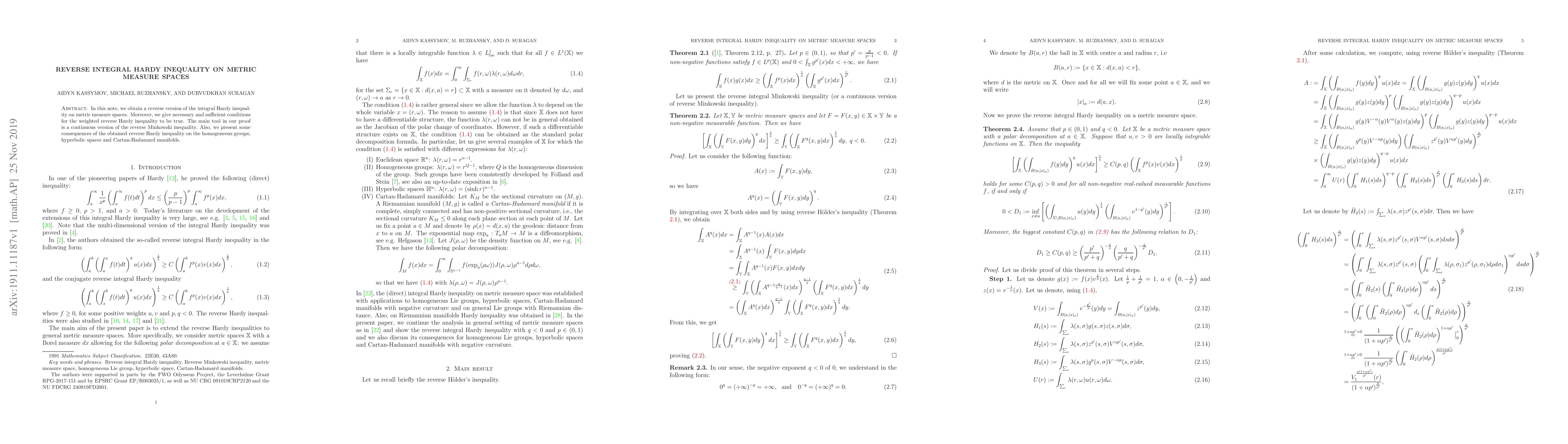 This paper establishes a reverse integral Hardy inequality on metric measure spaces and provides necessary and sufficient conditions for the weighted reverse Hardy inequality. The proof leverages a continuous reverse Minkowski inequality and explores implications for homogeneous groups, hyperbolic spaces, and Cartan-Hadamard manifolds.
