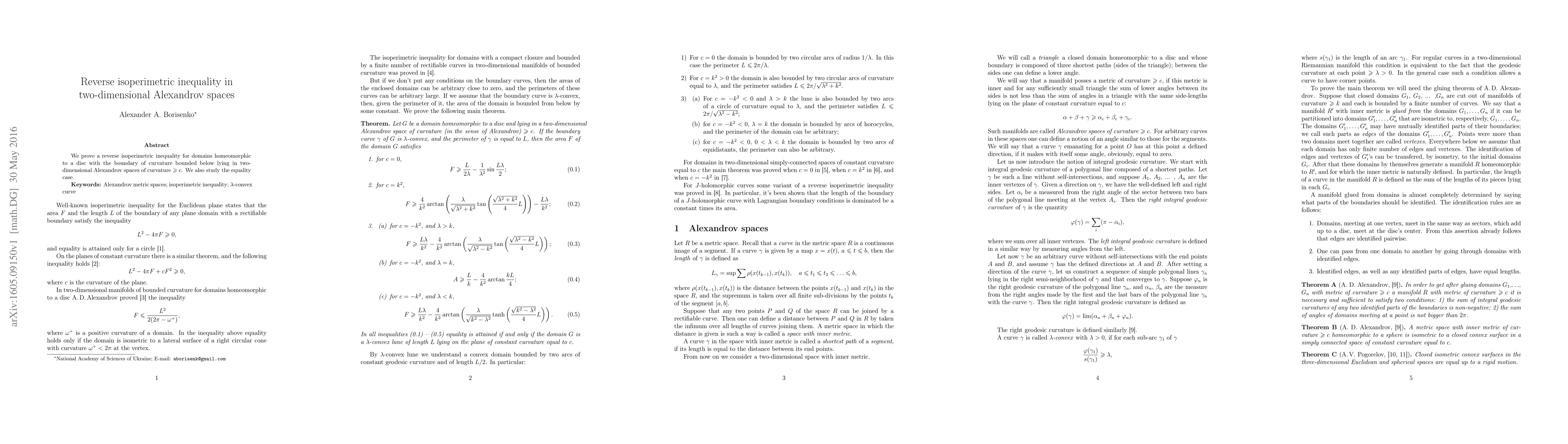 Summary: The paper establishes a reverse isoperimetric inequality for disc-like domains in Alexandrov spaces with nonnegative curvature, and investigates conditions for equality in this inequality.