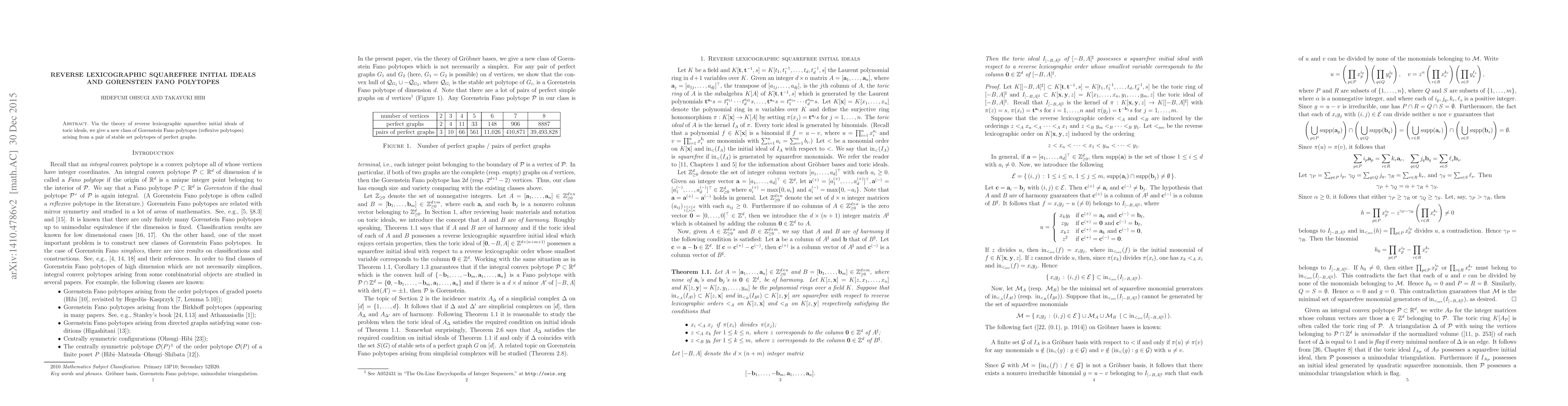 Summary: This paper introduces a new class of Gorenstein Fano polytopes using reverse lexicographic squarefree initial ideals of toric ideals, linking them to stable set polytopes of perfect graphs. This provides a novel approach to understanding reflexive polytopes.