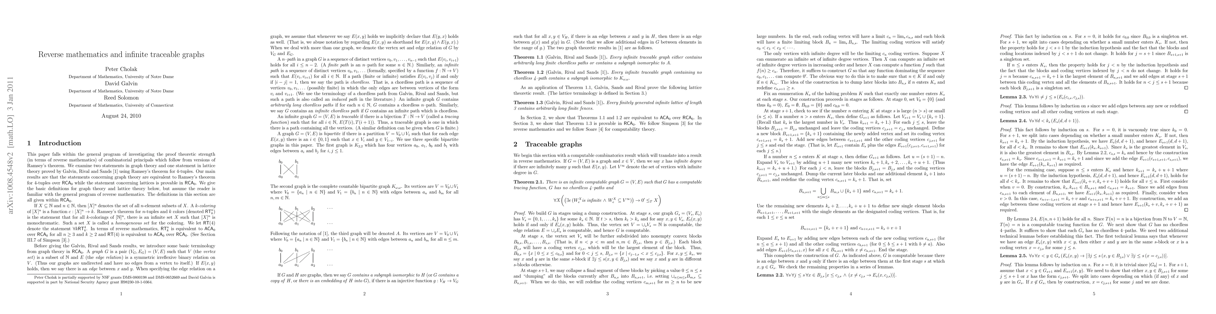 This paper falls within the general program of investigating the proof theoretic strength (in terms of reverse mathematics) of combinatorial principals which follow from versions of Ramsey's theorem. We examine two statements in graph theory and one statement in lattice theory proved by Galvin, Rival and Sands \cite{GRS:82} using Ramsey's theorem for 4-tuples. Our main results are that the statements concerning graph theory are equivalent to Ramsey's theorem for 4-tuples over $\RCA$ while the statement concerning lattices is provable in $\RCA$. Revised 12/2010. To appear in Archive for Mathematical Logic