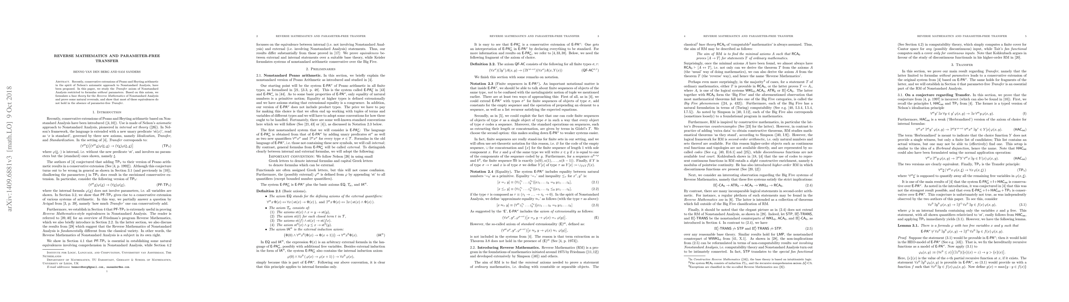 Recently, conservative extensions of Peano and Heyting arithmetic in the spirit of Nelson's axiomatic approach to Nonstandard Analysis, have been proposed. In this paper, we study the Transfer axiom of Nonstandard Analysis restricted to formulas without parameters. Based on this axiom, we formulate a base theory for the Reverse Mathematics of Nonstandard Analysis and prove some natural reversals, and show that most of these equivalences do not hold in the absence of parameter-free Transfer.