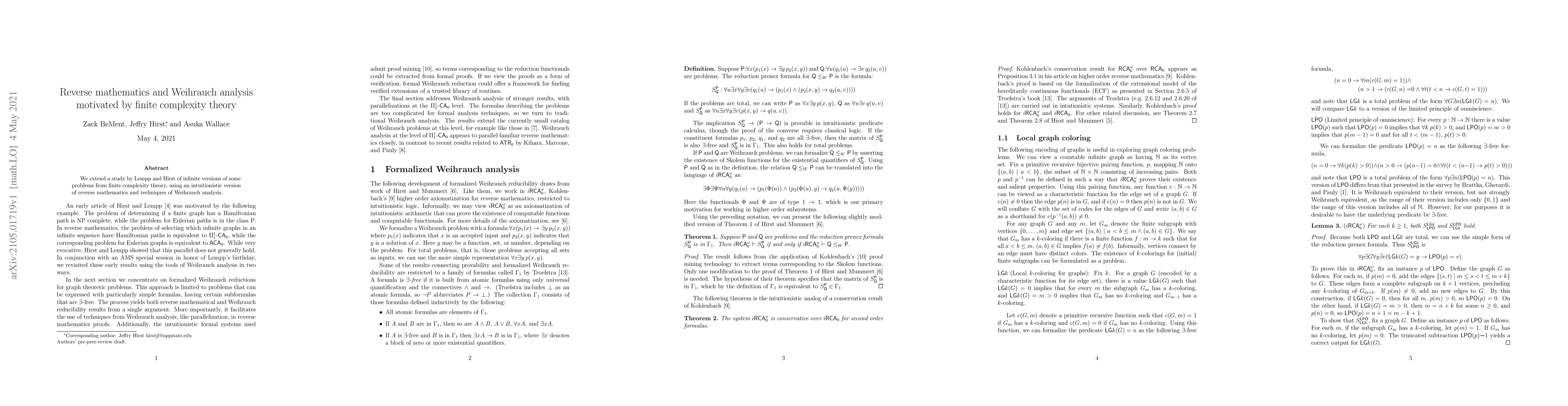 Summary: This paper extends the exploration of infinite versions of problems from finite complexity theory using intuitionistic reverse mathematics and Weihrauch analysis techniques. It aims to understand the underlying computational complexity in infinite settings.