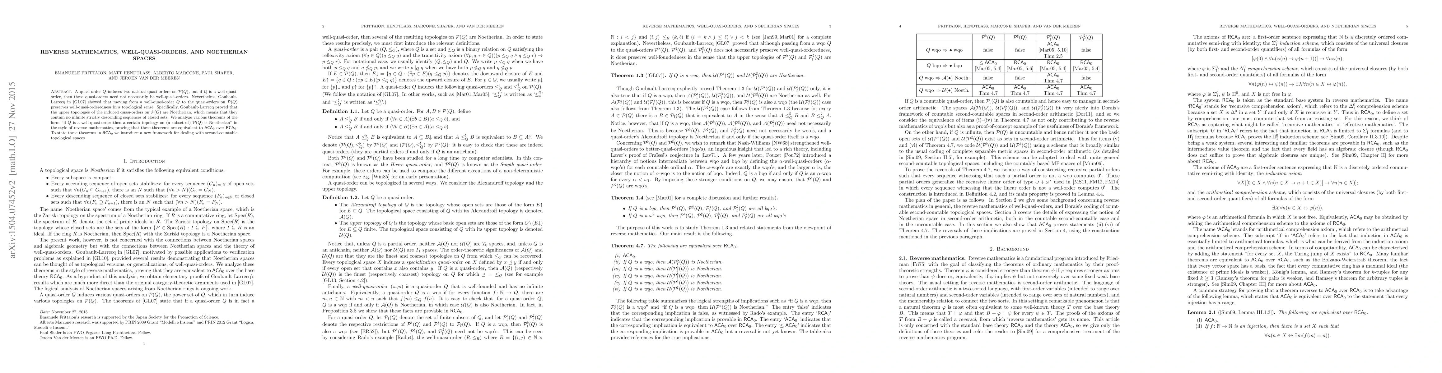 A quasi-order $Q$ induces two natural quasi-orders on $P(Q)$, but if $Q$ is a well-quasi-order, then these quasi-orders need not necessarily be well-quasi-orders. Nevertheless, Goubault-Larrecq showed that moving from a well-quasi-order $Q$ to the quasi-orders on $P(Q)$ preserves well-quasi-orderedness in a topological sense. Specifically, Goubault-Larrecq proved that the upper topologies of the induced quasi-orders on $P(Q)$ are Noetherian, which means that they contain no infinite strictly descending sequences of closed sets. We analyze various theorems of the form "if $Q$ is a well-quasi-order then a certain topology on (a subset of) $P(Q)$ is Noetherian" in the style of reverse mathematics, proving that these theorems are equivalent to ACA_0 over RCA_0. To state these theorems in RCA_0 we introduce a new framework for dealing with second-countable topological spaces.