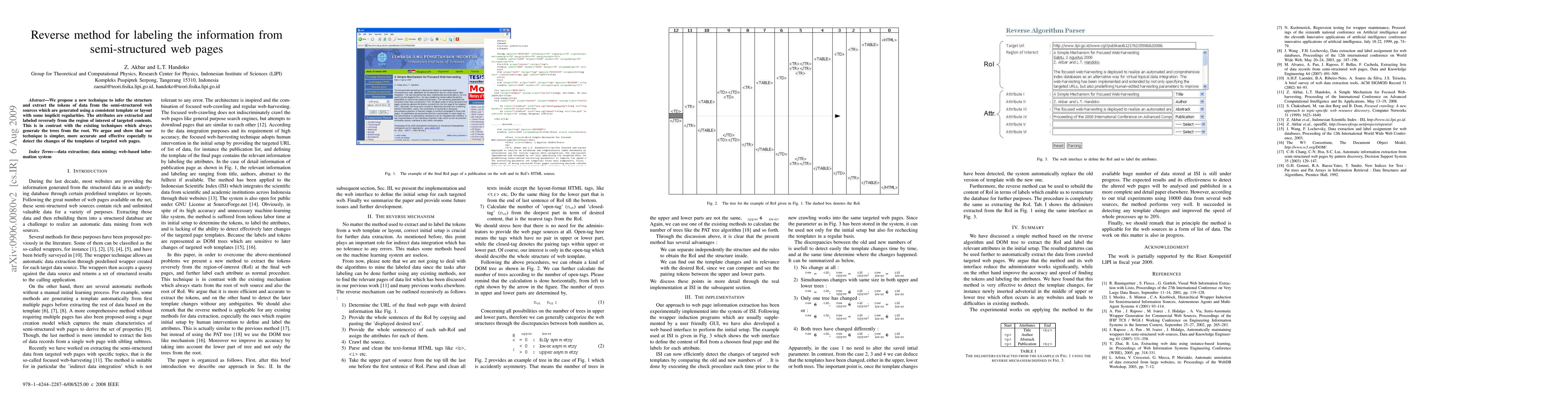 This paper proposes a novel reverse method for extracting and labeling data from semi-structured web pages, contrasting with traditional top-down tree generation. This bottom-up approach is argued to be simpler, more accurate, and effective for detecting template changes in web pages.